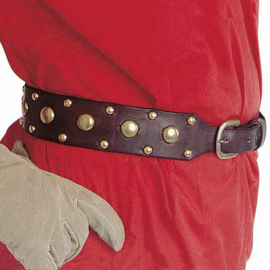 Nahkainen, niiteillä koristeltu ja vahvistettu, vyö sopii useimpien eri aikakausien puvustuksiin aina Assyriasta vallankumouksen aikaiseen Amerikkaan. Valmistettu paksusta ja laadukkaasta nahasta käsityönä. Tällaisen tukevan, 5 cm leveän, vyön avulla saat esim. tukevoitettua olkavyön paikalleen tai kannettua lonkalla niin miekat kuin tikaritkin. Vaihtoehtoina ruskea nahkavyö messinkisillä niiteillä ja soljella tai musta nahkavyö uushopeaisilla niiteillä ja –soljella.