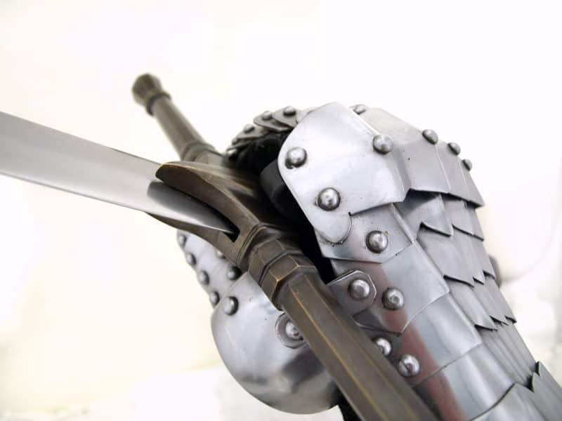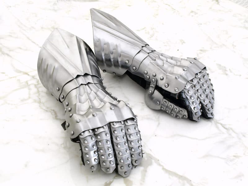 Tarjoamiemme niittitaisteluhansikkaiden sormien panssarointi on nivelletty ja peukalo on saranoitu, jotta aseesta saa tukevan otteen. Ranne on jäykkä, joten nämä jykevät hansikkaat olivat omiaan varsiaseiden ja muiden kahden käden aseiden käytössä taistelukentillä. Miekkailussa hansikkaat joissa myös ranne oli nivelletty mahdollistivat ketterämmän aseen käytön, mutta nivellykset tekivät panssarista myös haavoittuvaisemman. Tämän vuoksi eri aselajeihin kehittiin omanlaisensa panssaroidut taisteluhansikkaat, jolloin karkeampaa motoriikkaa vaativissa tehtävissä suojauskin oli paras mahdollinen.
