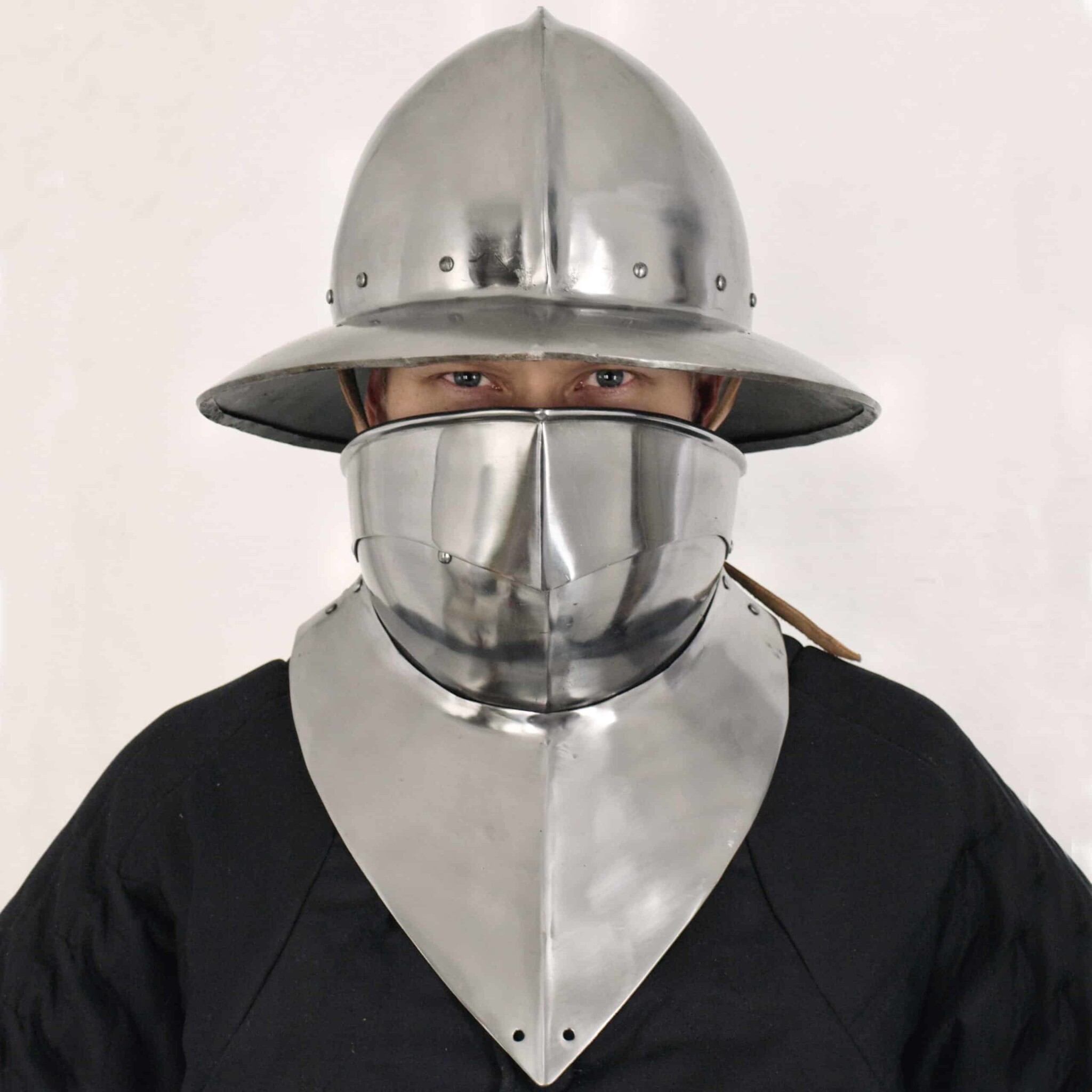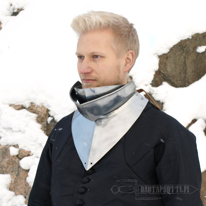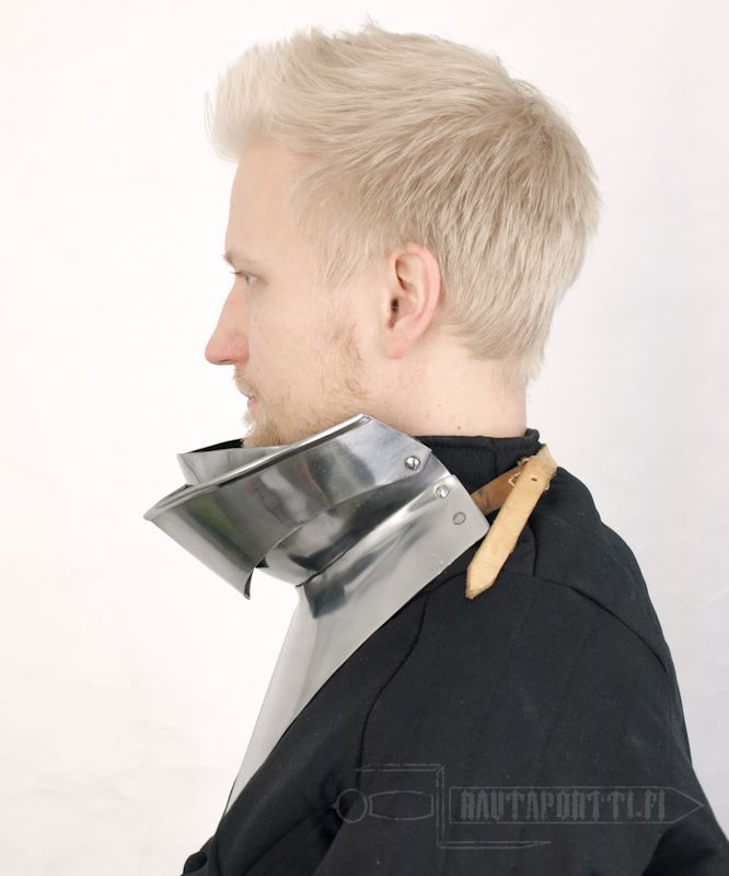 Tämä nivelletty bevor kiinnitetään takaa nahkahihnalla ja soljella. Käsinvalmistusmetodeista johtuen teräksen paksuus saattaa hieman vaihdella.
