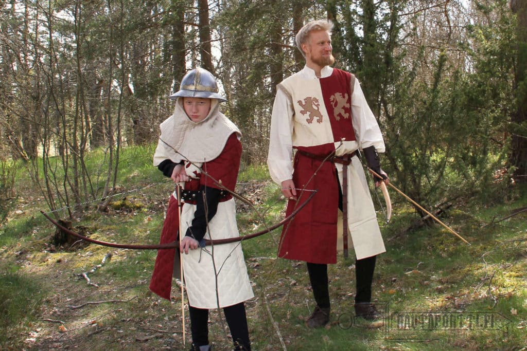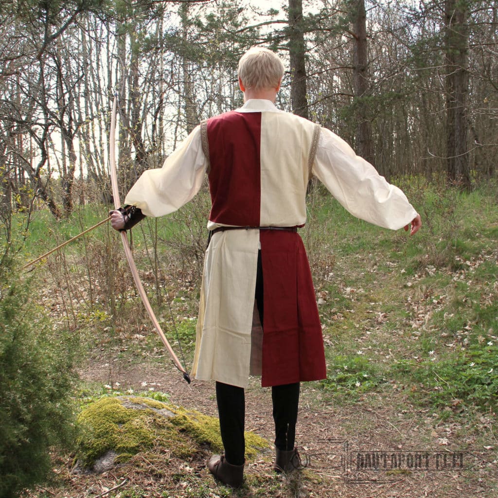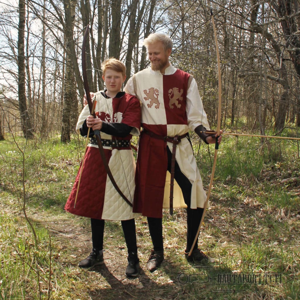 Hihaton asetakki on valmistettu paksusta ja kestävästä puuvillasta. Sisävuori on sileämpää puuvillaa, joten vaatetta on mukava käyttää. Asetakki on jaettu neljään vastakkaiseen luonnonvalkoisen ja viininpunaisen ruudun lohkoon. Asetakki on koristeltu antikoiduilla kultakirjailluilla heraldisilla leijonilla, jotka tuovat mieleen kaikkien aikojen kentien kuuluisimman ristiretkeläisen, Rikhard Leijonamielen. Asetakin kanssa tyypillisesti käytettiin pitkää vyötä. Asetakin mukana ei tule vyötä, mutta voit valita tyyliisi sopivan vyön valikoimastamme tai käyttää mitä tahansa valmiiksi kotoa löytyvää vyötä asetakin kanssa.
