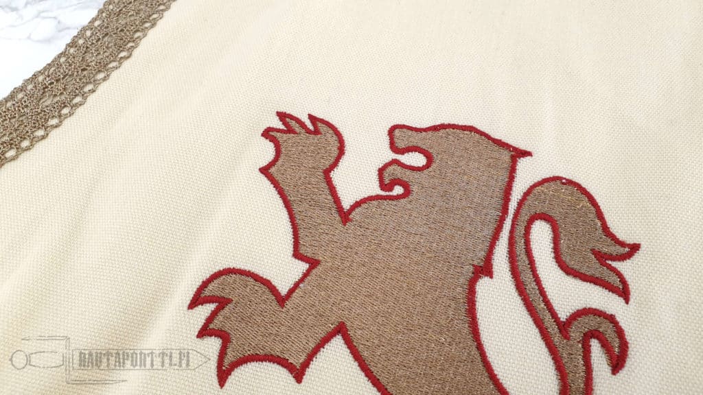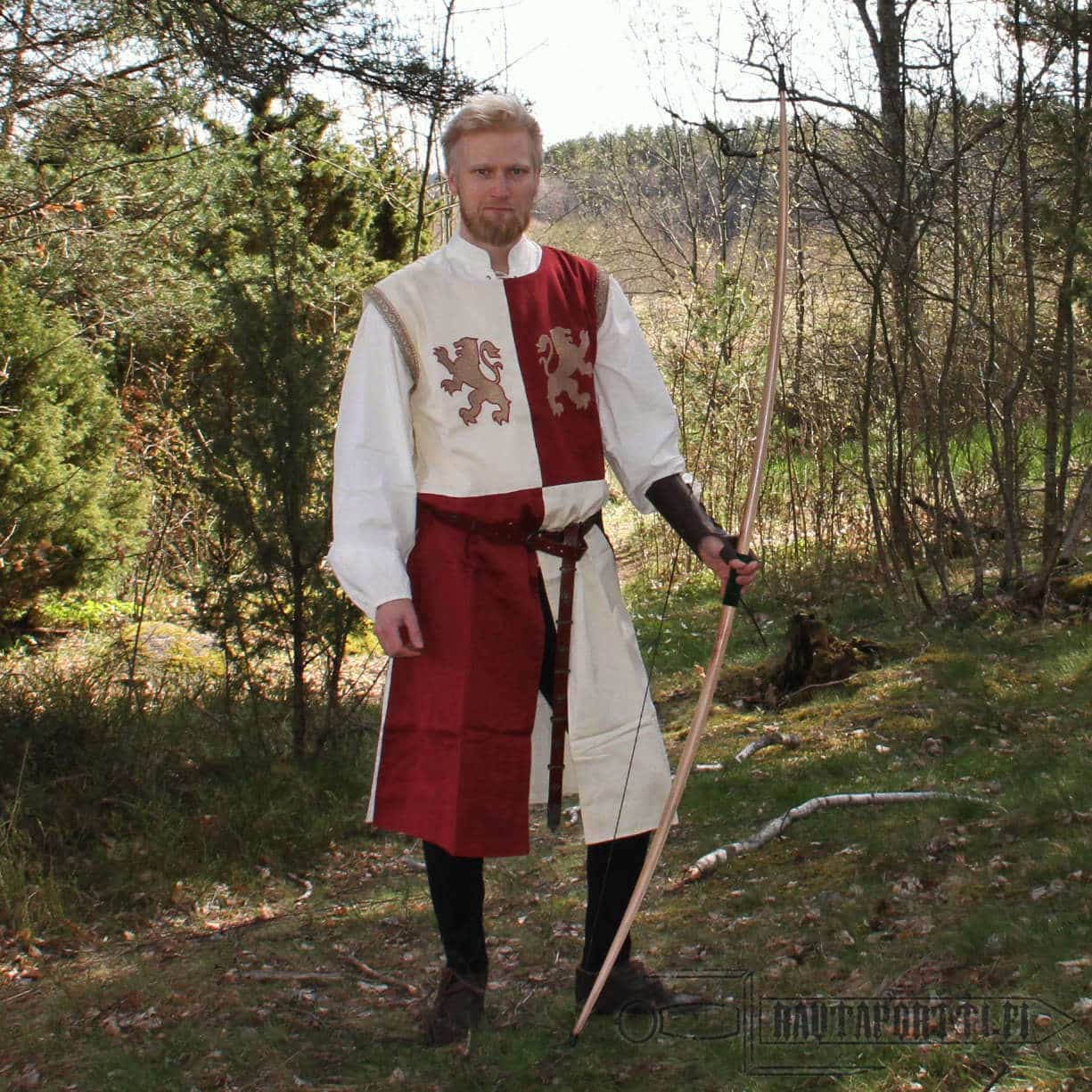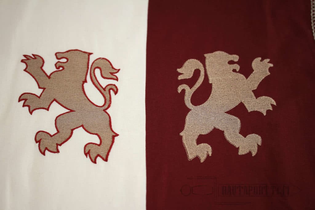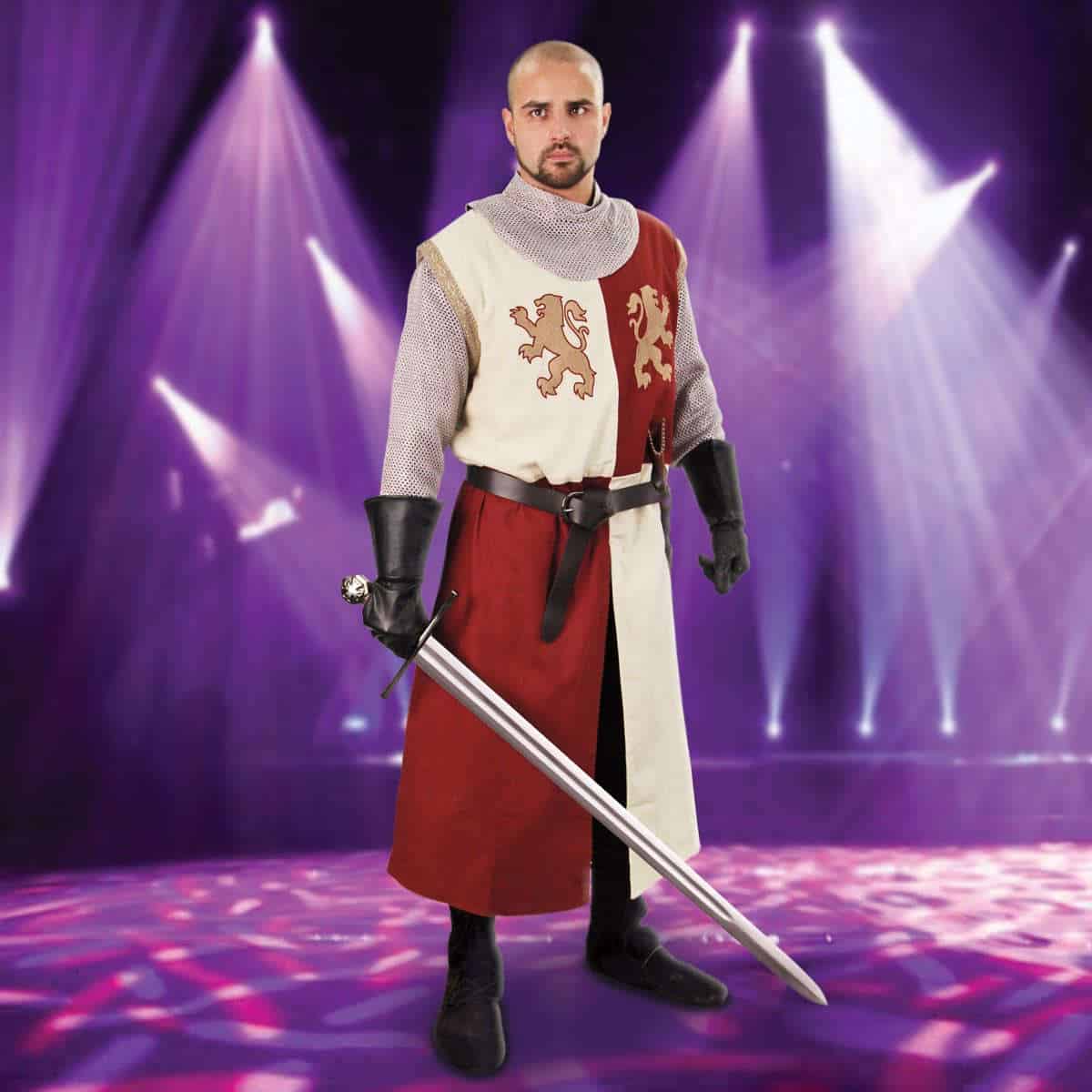 Hihaton asetakki on valmistettu paksusta ja kestävästä puuvillasta. Sisävuori on sileämpää puuvillaa, joten vaatetta on mukava käyttää. Asetakki on jaettu neljään vastakkaiseen luonnonvalkoisen ja viininpunaisen ruudun lohkoon. Asetakki on koristeltu antikoiduilla kultakirjailluilla heraldisilla leijonilla, jotka tuovat mieleen kaikkien aikojen kentien kuuluisimman ristiretkeläisen, Rikhard Leijonamielen. Asetakin kanssa tyypillisesti käytettiin pitkää vyötä. Asetakin mukana ei tule vyötä, mutta voit valita tyyliisi sopivan vyön valikoimastamme tai käyttää mitä tahansa valmiiksi kotoa löytyvää vyötä asetakin kanssa.
