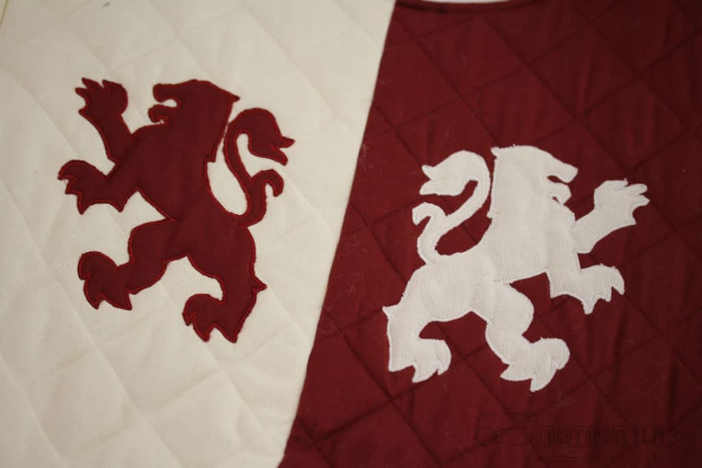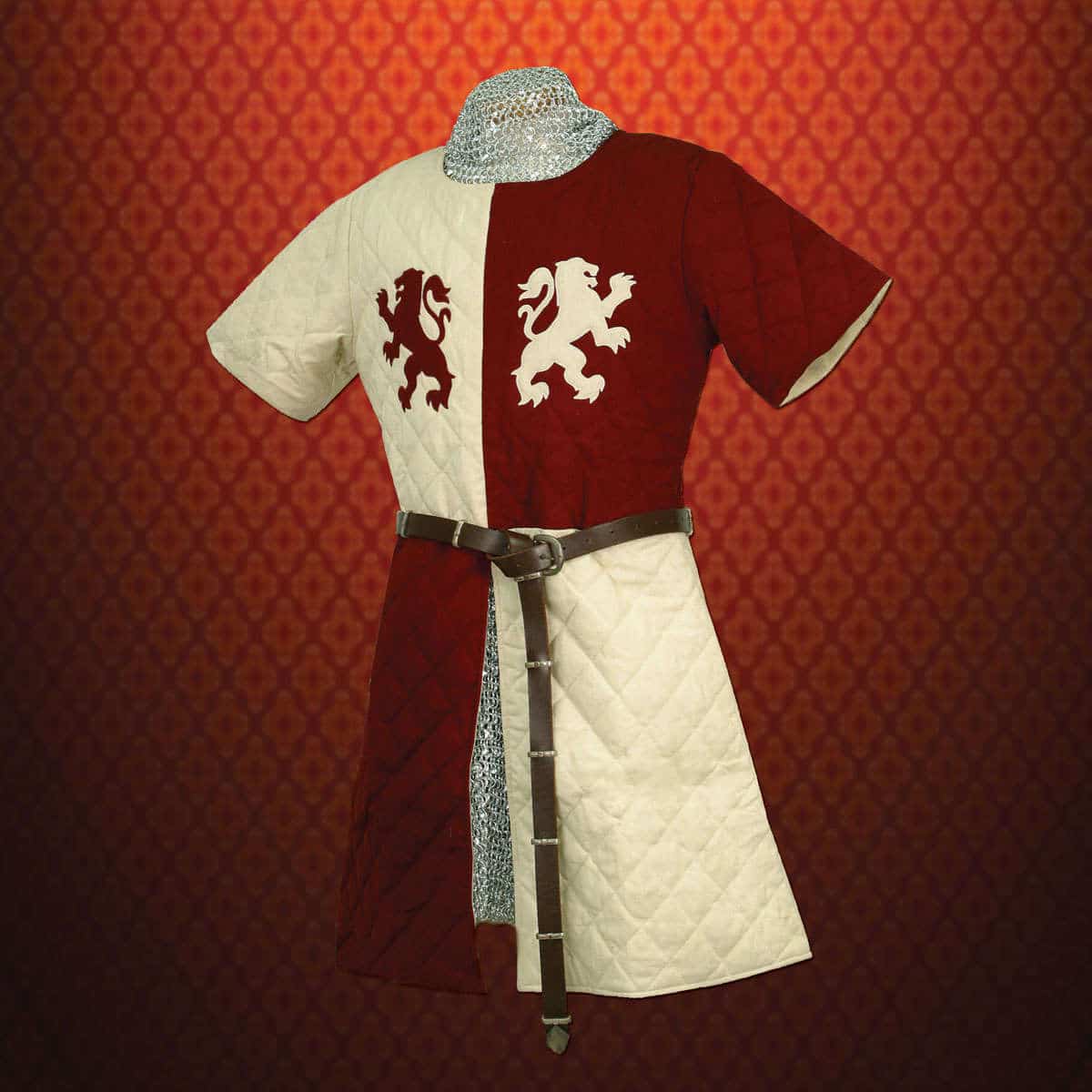 Gambeson on jaettu neljään vastakkaiseen luonnonvalkoisen ja viininpunaisen ruudun lohkoon. Gambesonin rintamus on koristeltu heraldisilla leijonilla, jotka tuovat mieleen kaikkien aikojen kentien kuuluisimman ristiretkeläisen, Rikhard Leijonamielen.