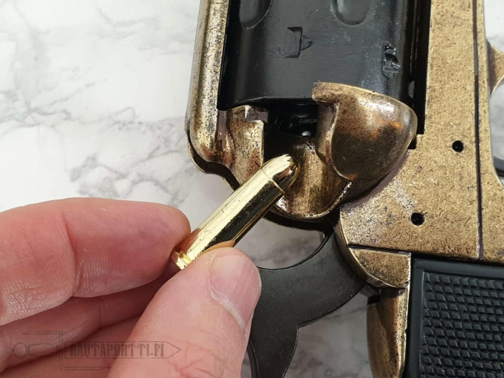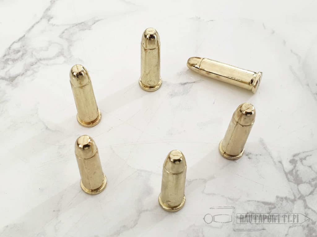 Tämän koristepatruunan saa laitettua myös COLT PYTHON .357 Magnum -kaliiperin revolverin rullaan, mutta koska patruunaa ei ole suunniteltu tätä revolveria varten se on ihan pikkuisen liian pieni rullan patruunapesään. Patruunat saattavat siis päästä liukumaan edestakaisin Pythonin rullassa, mutta toki revolverin latausta pääsee simuloimaan näinkin, vaikka täysin yhteensopivat eivät olekaan.