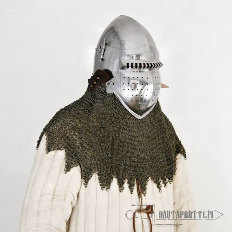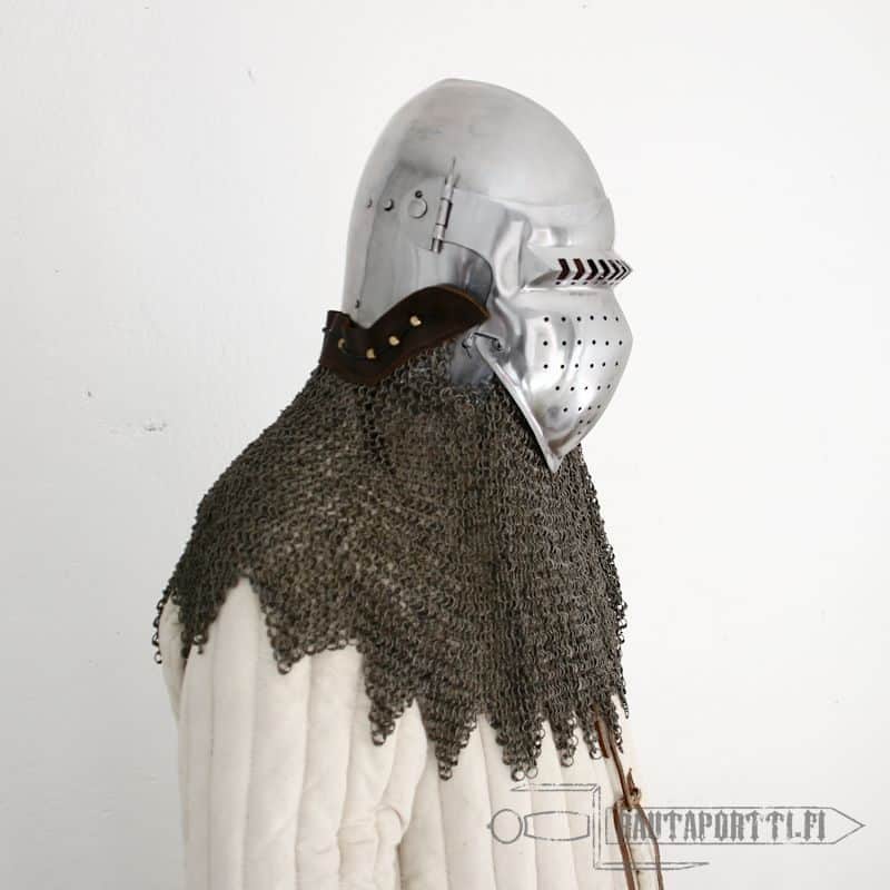 Bascinettiin liitettiin tyypillisesti rengashaarniskakaulus, eli aventail, kaulaa ja niskaa suojaamaan. Kypärään voi itse niitata vervellet aventailin helppoa kiinnittämistä varten. Vervellet ovat messinkisiä nippoja, jotka kiertävät kypärän alareunaa ja joiden avulla aventailin nahkareunuksen saa kiinnitettyä helposti kiinni kypärään. Tämän kypärän mukana ei tule vervellejä tai aventailia, mutta kaikki valikoimastamme löytyvät aventailit sopivat yhteen tämän kypärän kanssa.
