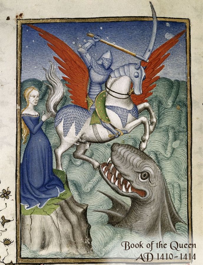 Nimen tämä keskiaikainen bascinet on saanut mahtavasta keskiaikaista fantasiaa edustavasta piirroksesta. Kreikkalaisista sankareista kovin, Perseus, lentää Pegasoksella, siivekkäällä hevosellaan, ja taistelee merihirviötä vastaan aseenaan valtava viikate. Perseus on pelastamassa Andromedaa, joka on tarjottu uhrilahjaksi merihirviölle hirviön lepyttämiseksi. Perseus kuitenkin pelastaa päivän tappamalla hirviön ja samalla voittaa Andromedaan vaimokseen. Kuvassa Perseuksella on päässään hyvin samankaltainen kypärä kuin tämä myymämme kappale.