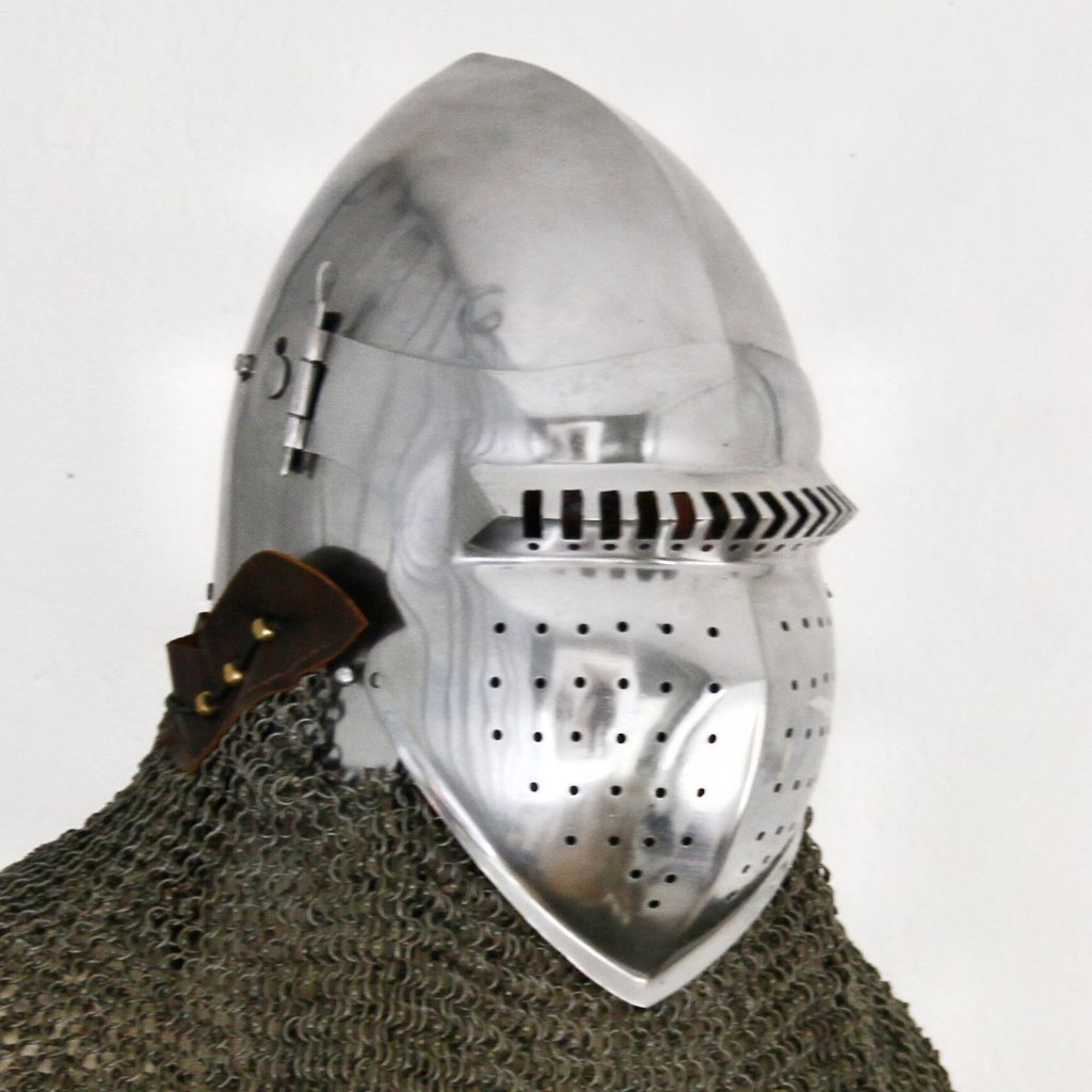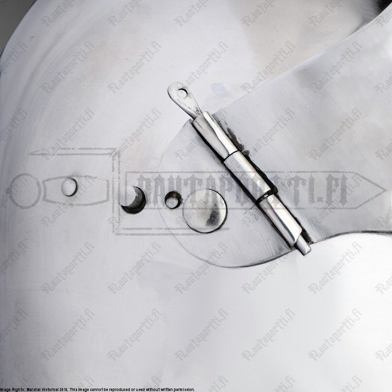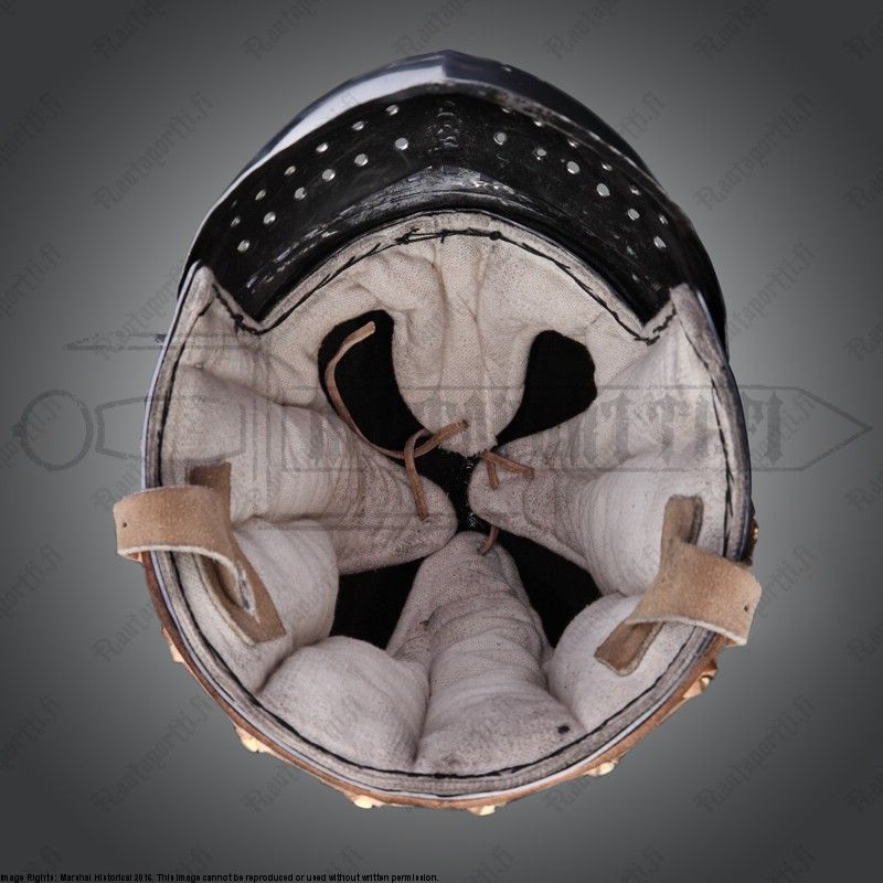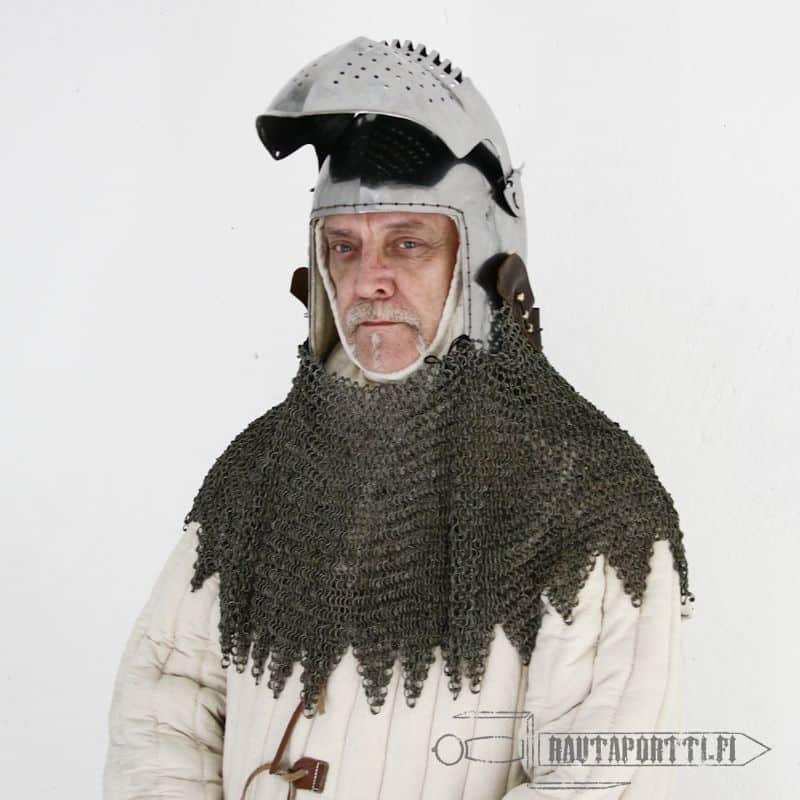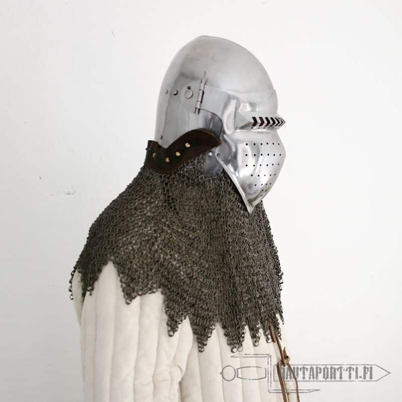 Bascinettiin liitettiin tyypillisesti rengashaarniskakaulus, eli aventail, kaulaa ja niskaa suojaamaan ja tässä kypärässä onkin vervellet valmiina kiinni aventailin helppoa kiinnittämistä varten. Vervellet ovat messinkisiä nippoja, jotka kiertävät kypärän alareunaa ja joiden avulla aventailin nahkareunuksen saa kiinnitettyä helposti kiinni kypärään. Tämän kypärän mukana ei tule aventailia, mutta kaikki valikoimastamme löytyvät aventailit sopivat yhteen tämän kypärän kanssa.