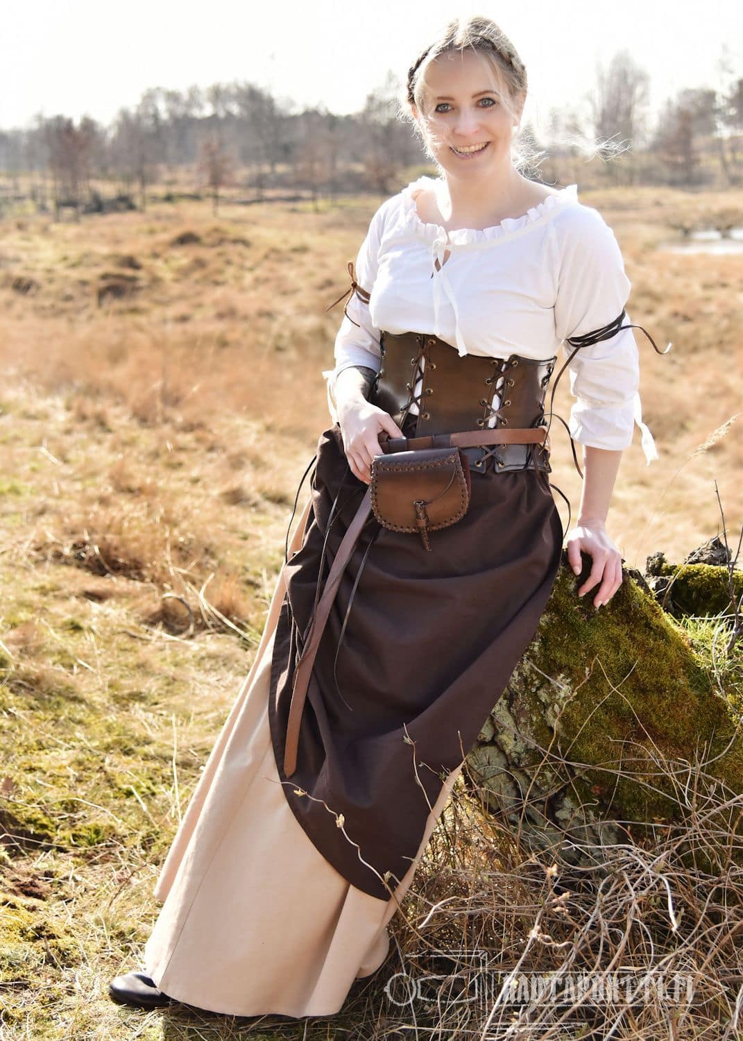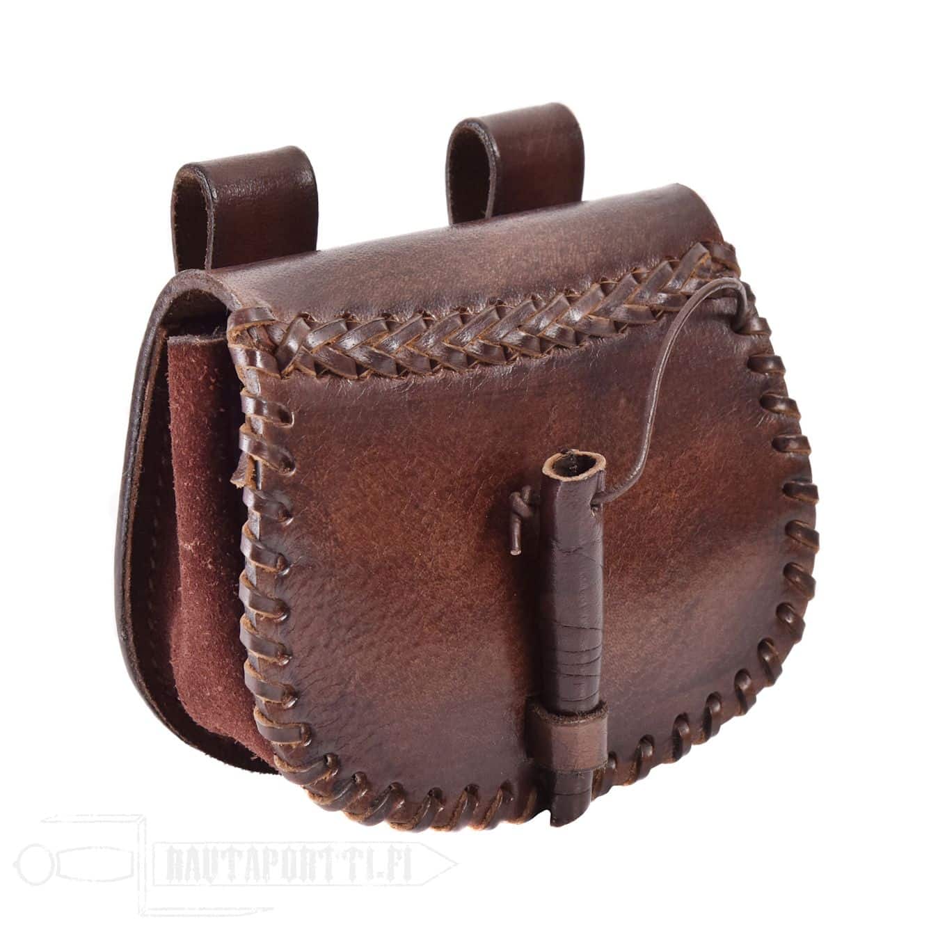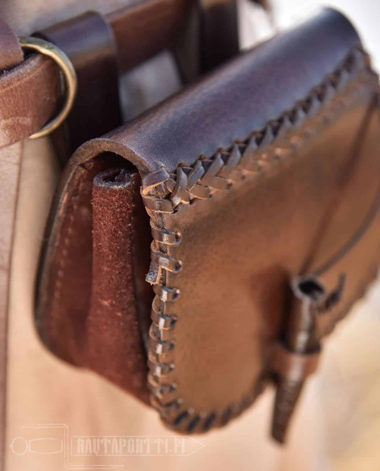Tämä pienehkö tarvikelaukku on valmistettu tukevasta 2 mm paksusta nahasta ja on sisältä yhtä tilaa ilman erillisiä sisätaskuja. Suljettava läppä kiinnitetään nahasta tehdyllä sulkijanapilla. Reunoja koristaa ja vahvistaa litteä nahkanyöripunos. Laukun keskiosa on pehmeää mokkanahkaa. Laukku on jätetty koristelemattomaksi, joten se käy historiallisesti mahdollisimman pitkälle ajanjaksolle.