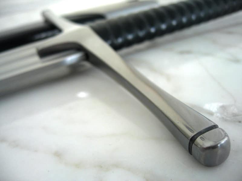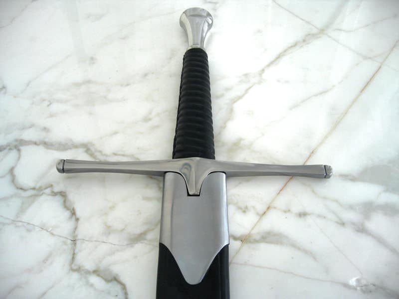 Sodan miekka, Pitkämiekka, Suurmiekka, Bastardimiekka, Puolentoista käden miekka ja joskus jopa Kahden käden miekka. Vaikka rakkaan lapsen monta nimeä aiheuttavatkin keräilijöille päänvaivaa, niin on selvää, että tällaiset isot miekat olivat aikanaan suosittuja aseita ja käytössä kaikkialla Euroopassa. Miekan pituus antoi paitsi kantamaa lyönteihin, myös lisää tehoa kärjen liikkuessa selkästi nopeammin kuin lyhyemmissä miekoissa. Kun miekkoihin keksittiin lisätä pitkä ricasso (terän osa heti väistin yläpuolella, jota ei ole tarkoitettukaan teroitettavaksi), niin käyttötavat ja tekniikat lisääntyivät huomattavasti. Nyt miekkaa saattoi esimerkiksi käyttää lyhyen keihään tavoin pistoaseena. Toinen käsi kahvalla ja toinen ricassolla tukemassa ja ohjaamassa terää antoivat pistoille lisää voimaa ja jämäkkyyttä. Myymämme jäljennös on yhtä vaikuttava ja tehokas ase kuin alkuperäisetkin. Terä on valmistettu korkean hiilipitoisuuden hiiliteräksestä ja lämpökäsitelty huolella. Terä on kuin jäykkä jousi: kova mutta joustava. Kahva on nahalla päällystettyä puuta. Väisti ja ponsi ovat terästä. Hintaan sisältyy kuvissa näkyvä nahkainen huotra. Tämän tyyppinen miekka kuuluu ehdottomasti jokaiseen miekkakokoelmaan.