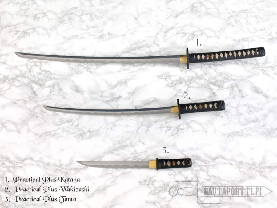 Practical Plus katanan Tsuka (kahva) on päällystetty aidolla Samella (rauskunnahalla) ja Tsuka-Ito (kahvan nyöritys) on varta vasten kehitetty hyviä pito-ominaisuuksia varten. Pitkä nakago (ruoti) on kiinnitetty tsukaan perinteisesti kahdella bambutapilla. Koshiraeksi kutsutaan kokonaisuutena miekan kahvaa, väistilevyä, tuppea ja muita miekan osia jotka kasataan valmiin terän päälle muodostaen lopulta kokonaisen ja toimivan miekan. Tässä miekassa nämä osat (eli koshirae) on koristeltu perinteisin kanukankukka-motiivein. Menuki, tsuka-iton alla oleva pitoa lisäävä koriste, on lohikäärme. Koristeellinen Tsuba (väistilevy) on perinteiseen tapaan rautainen ja siinä on auringonsädekuvio ja messinkinen habaki (kaulus). Mattamustaa sayaa (tuppea) koristaa musta puuvillainen sageo (kiinnitysnyöri). Practical Plus-sarjan Wakizashi ja Tanto ovat oivat parit tälle katanalle ja yhdessä ne muodostavat käytännöllisen, näyttävän ja perinteisen samurai-setin.