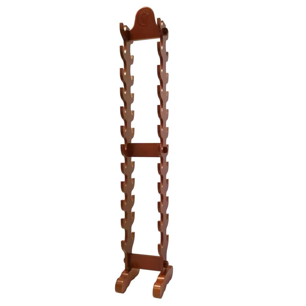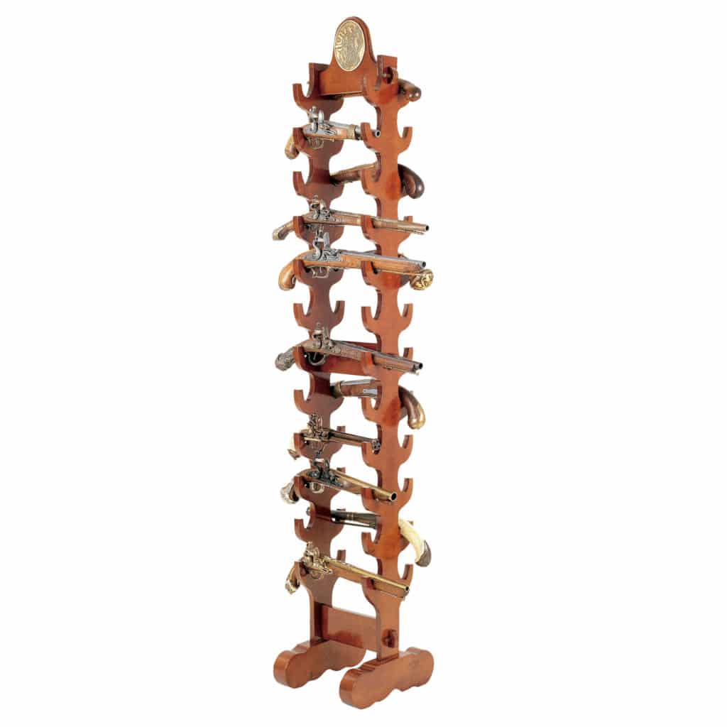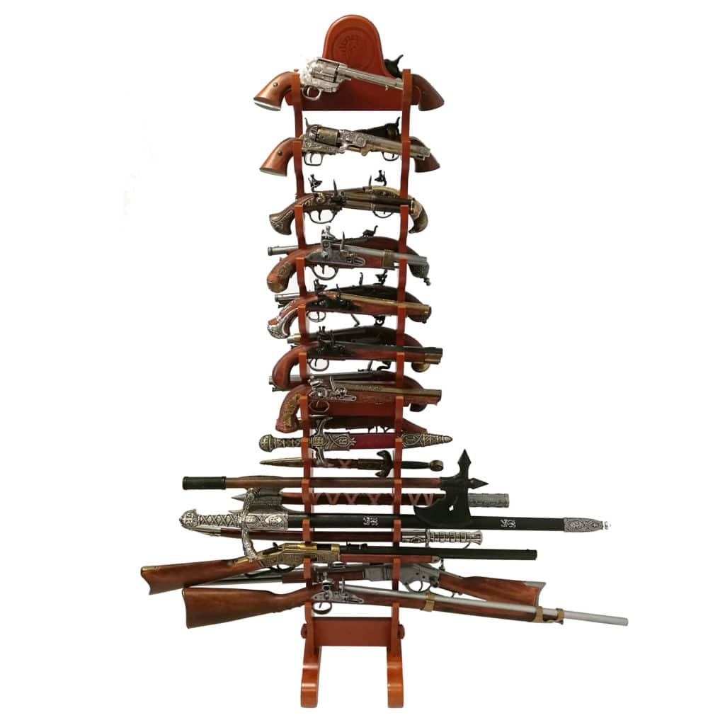 Näyttävä puinen aseteline, johon saat koko kokoelmasi siististi järjestykseen ja näytille. Telineessä on oma jalustansa, jolla se pysyy pystyssä ilman seinään ruuvaamista. Telineen voi siis laittaa pystyyn vaikka keskellä huonetta.