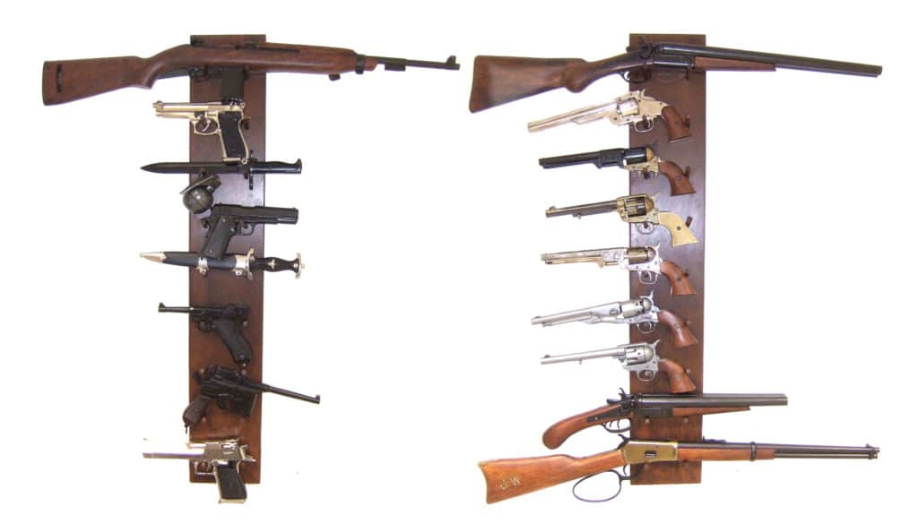 Paketissa on mukana kaksi erillistä telinettä, joissa molemmissa on paikat yhdeksälle aseelle. Tämän setin kanssa saat siis kaikkiaan 18 asetta siististi esille ja näytille.