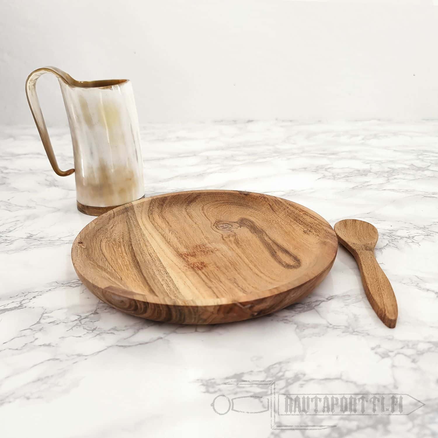Tämä puulautanen on valmistettu akaasiapuusta. Muinaiset egyptiläiset sekä heprealaiset pitivät akaasia ikuisen elämän ja kuolemattomuuden symbolina sen kestävyyden ja ikivihreyden johdosta. Tämä lautanen sopii täydellisesti larppaukseen tai historianelävöitykseen niin antiikin aikaan, viikinkiajalle kuin keskiajallekin.