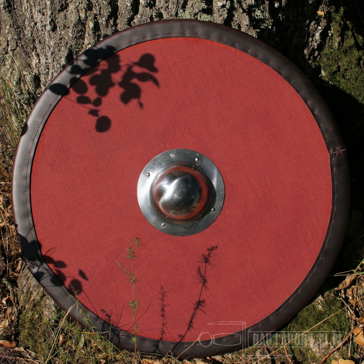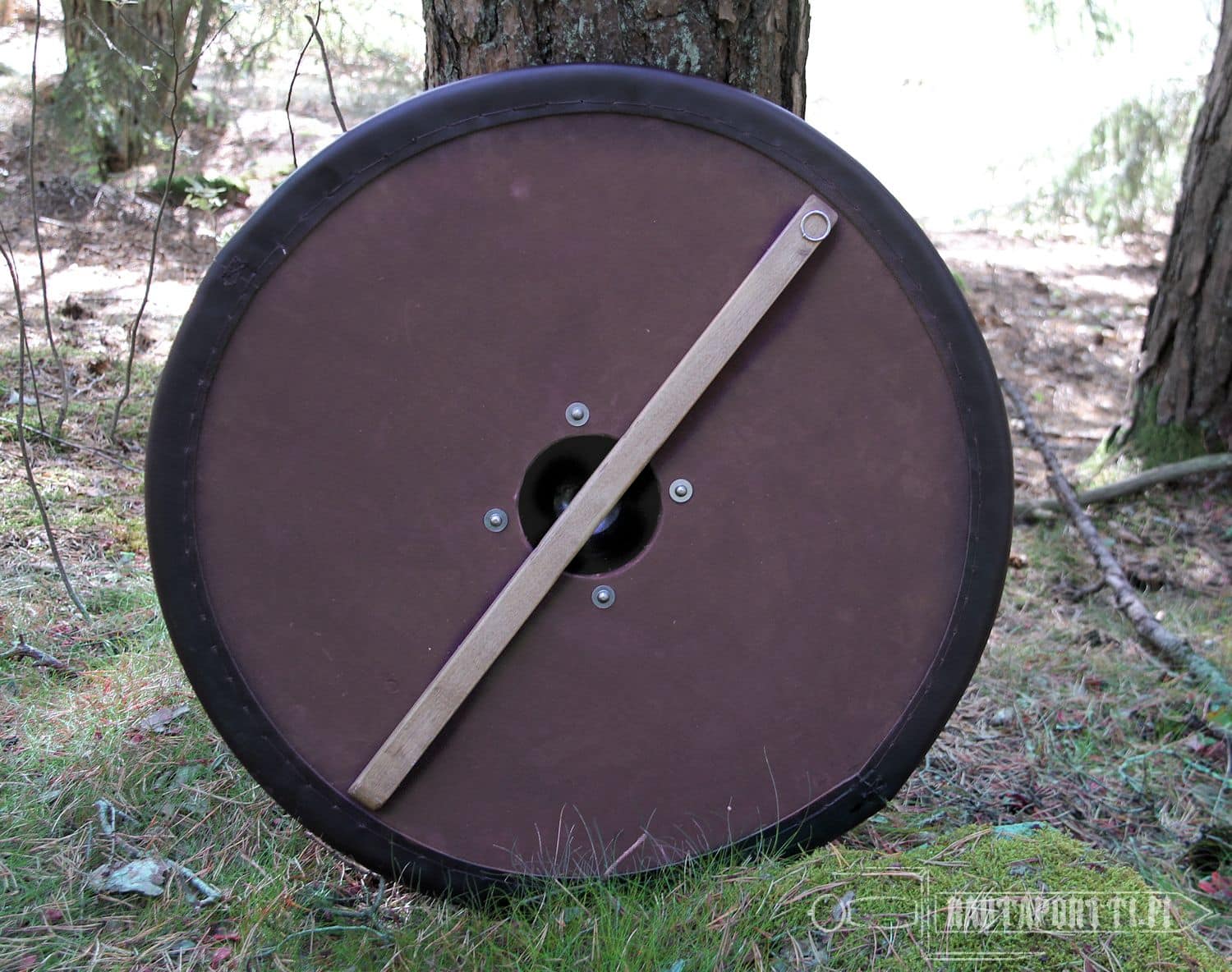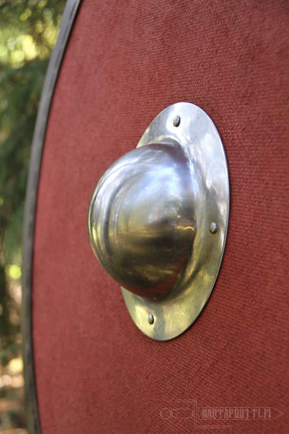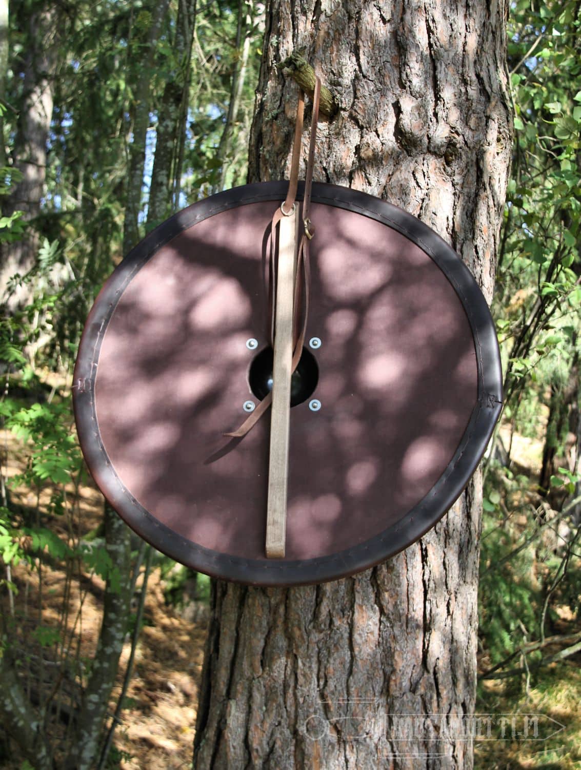 Myymämme perinteinen pyöreä puinen viikinkikilpi on valmistettu 9mm paksusta vanerista. Kilven etuosa on päällystetty juuttikankaalla, joka on maalattu punamullan, eli autenttisen rautaoksidin, väriseksi. Pintaan voit itse maalata haluamiasi symboleja tai koristeita, kuten vaikkapa oman kiltasi, kaartisi tai klaanisi tunnukset. Kilven keskellä on kupura, joka on valmistettu 2mm paksusta teräksestä ja niitattu kilven läpi. Kupuran halkaisija on 19 cm ja korkeus 7 cm.