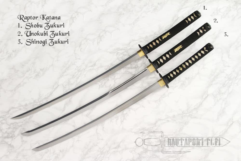 Raptor-sarjan katania on saatavilla usealla eri terämallilla. Tässä Raptor-katanassa on Shobu Zukuri (Iiriksen lehti) mallin terätyyppi, joka tunnetaan elegantista muodostaan ja vahvasta leikkausvoimastaan. Shobu-Zukurin silmiinpistävin piirre on yokoten, eli kärjen (kissakin) muusta terästä erottavan taitekohdan, puuttuminen. Tämä terätyyli oli suosittu Nanbokucho-kaudella, eli vuosina 1336-1398, ja sen suosio jatkui myös myöhemmälle Muromachi-kaudelle.