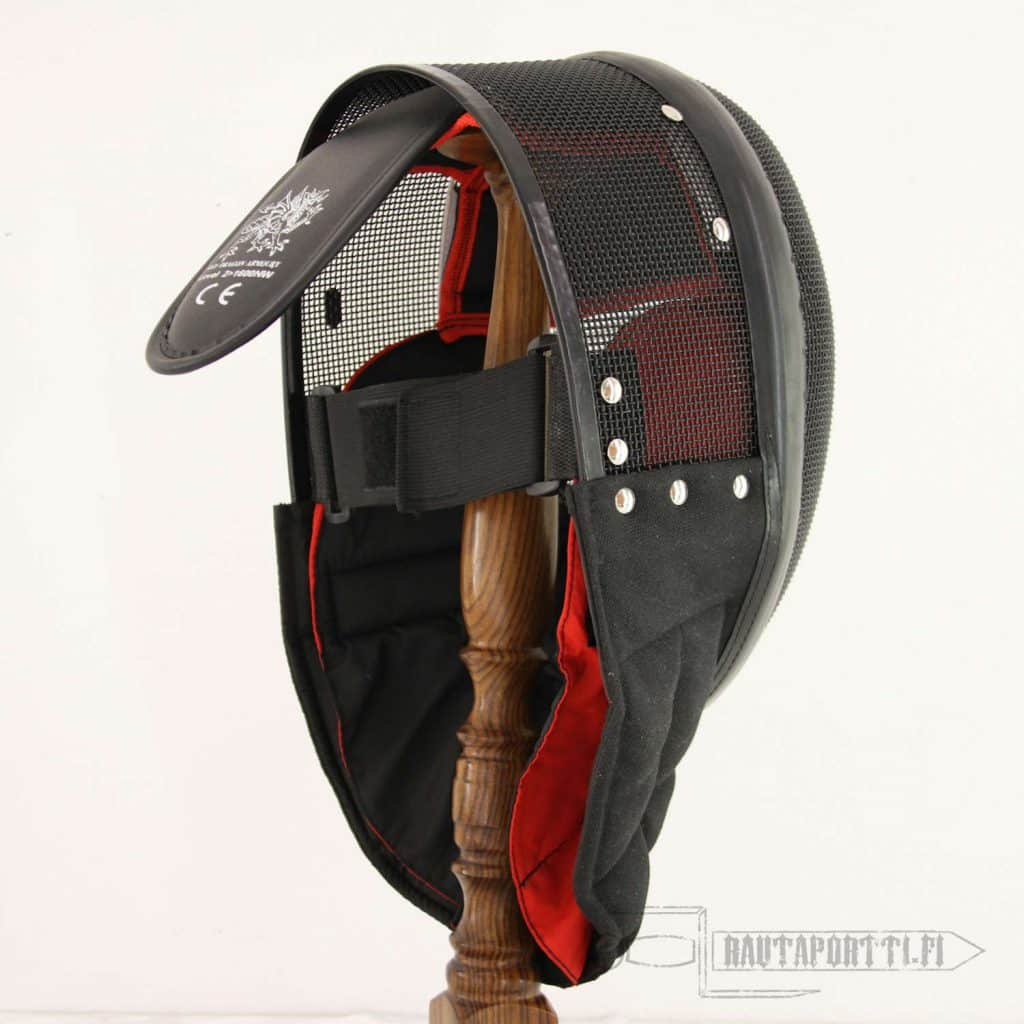 Red Dragonin -miekkailumaski on kehitetty harrastukseensa panostaville ja kilpailuihin osallistuville HEMA-harrastajille. Valikoimistamme löytyvä perustason 350N-maski riittää suurimpaan osaan HEMA-harjoitteita, mutta jos kaipaat jykevämmän tason suojausta tai aiot osallistua turnauksiin, tämä maski on tehty juuri sinulle. Maski täyttää eurooppalaisen kilpailuihin tarvittavan CEN standardin tason 2 vaatimukset. Maskin värinä on musta HEMA-standardi, kaulasuoja antaa erittäin hyvän suojan pistoja vastaan ja kasvoja suojaava teräsverkko on kestävää ja joustavaa eikä lommoonnu helposti. Sisäpuolen pehmusteet on kiinni tarranauhalla, joten sisävuoren saa irti ja pestyä (ainoastaan käsipesu).