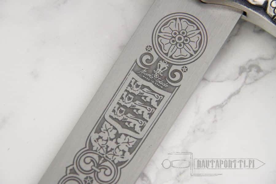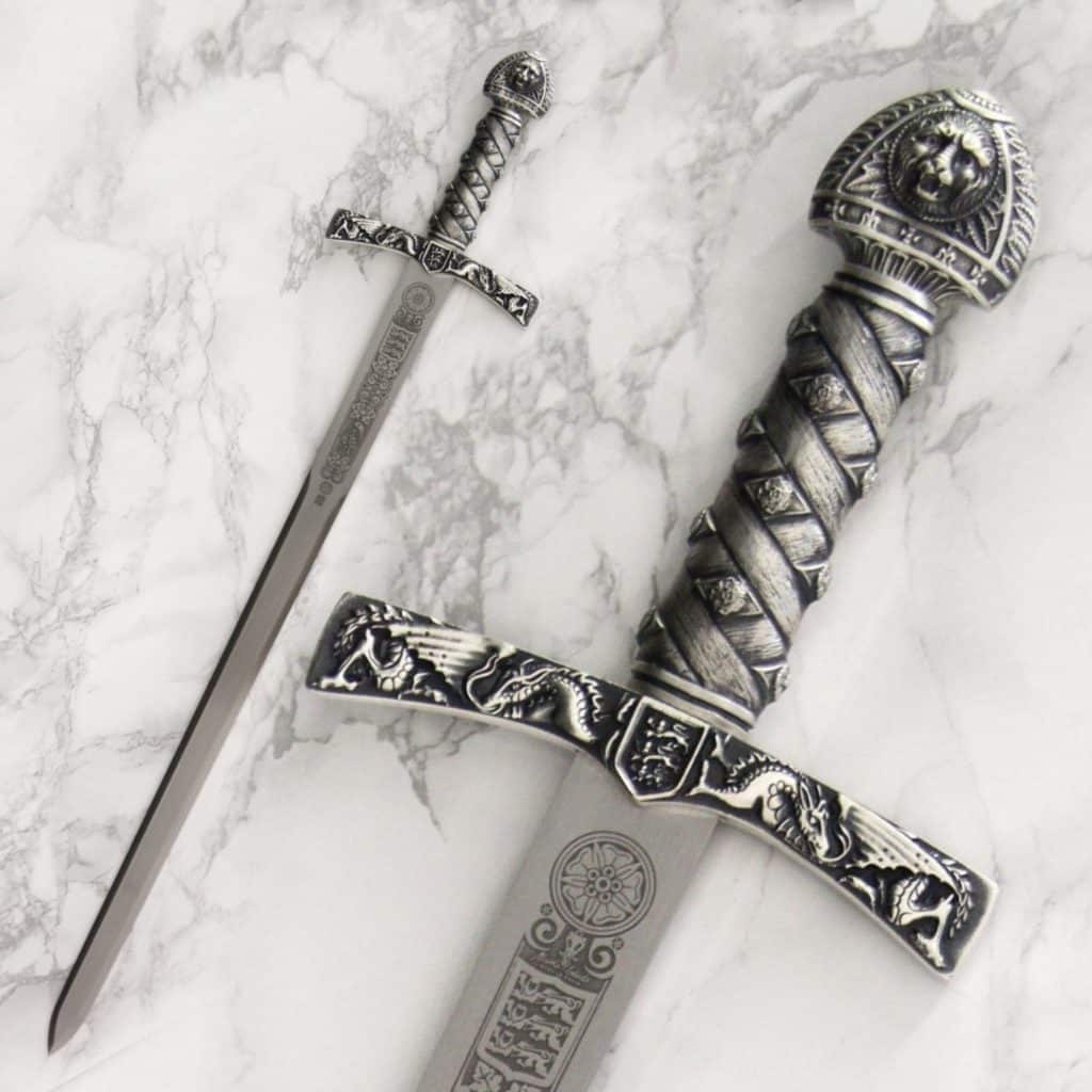 Rikhardin henkilökohtainen kyvykkyys oli inspiroivaa hänen johtamilleen joukoille, hänen mottonsa Dieu et mon Droit ”Jumala ja minun oikeuteni” on yhä Britannian kuningashuoneen mottona, ja hänen heraldinen tunnuksensa, kolme leijonaa, on yhä osa kuninkaallista vaakunaa. Tuo tunnus löytyy luonnollisesti myös tämän koristeellisen miekan ornamenteista ja etsauksista, ritarien, leijonien ja lohikäärmeiden ohella.