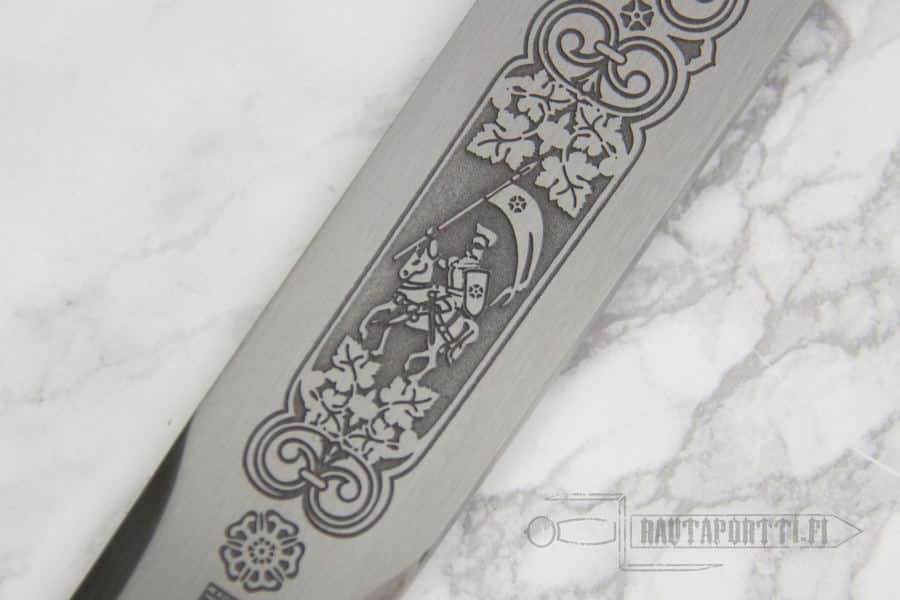 Valmistettu ruostumattomasta teräksestä Esim. koristeeksi, asun osaksi tai kevyisiin leikkausharjoituksiin Mukana ei tule huotraa Kokonaispituus 75,8 cm Terävyysaste: Teroittamaton