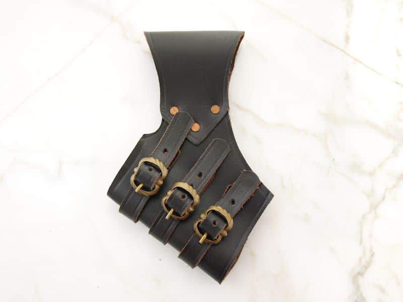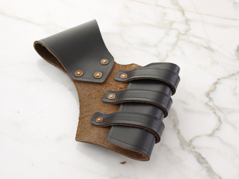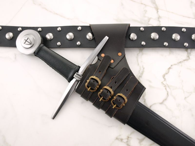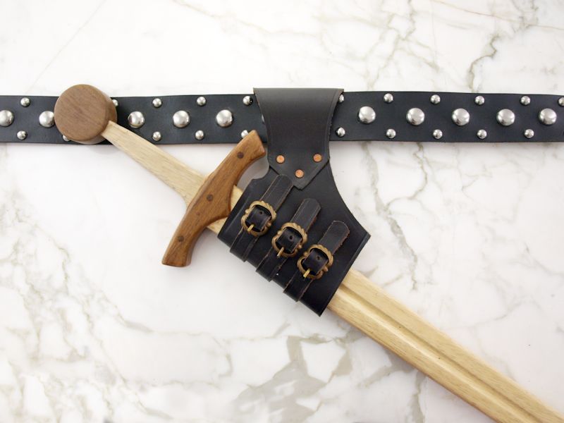 Valmistettu käsityönä noin 3 mm paksusta tummanruskeasta nahasta. Sopii yhteen max. 7 cm leveiden vöiden kanssa. Sopii sellaisenaan yhteen tuppien (tai lateksimiekkojen) kanssa, joiden ympärysmitta on 6-11 cm. Kannatinta saa helposti muutettua myös erikokoisten miekkojen kantamiseen.