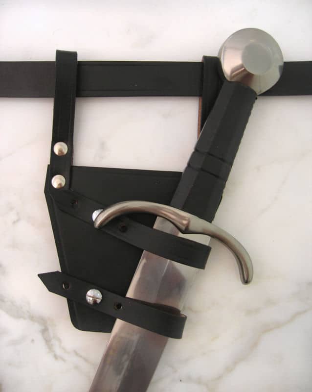 Sotaan tai kaksintaisteluun lähdettäessä ei kannettu mukana mitään turhaa. Tupet ja huotrat jätettiin odottamaan voittajan paluuta, sillä taistelussa ne olisivat vain tiellä ja haittana. Taisteluissa mukana pidettävät vara-aseet kannettiin terä paljaana ja nopeasti vedettävinä metallisissa renkaissa tai myymämme kaltaisissa nahkaisissa ripustuksissa. Ritarilla saattoi olla esim. pitkämiekka kädessä ja lyhyempi yhden käden miekka vasemmalla kupeella ja tikari oikealla. Nahkahihnojen pituutta säätämällä saat sovitettua tähän ripustukseen minkä tahansa tikarin teräleveydestä riippumatta. Mukana ei toimiteta vyötä.
