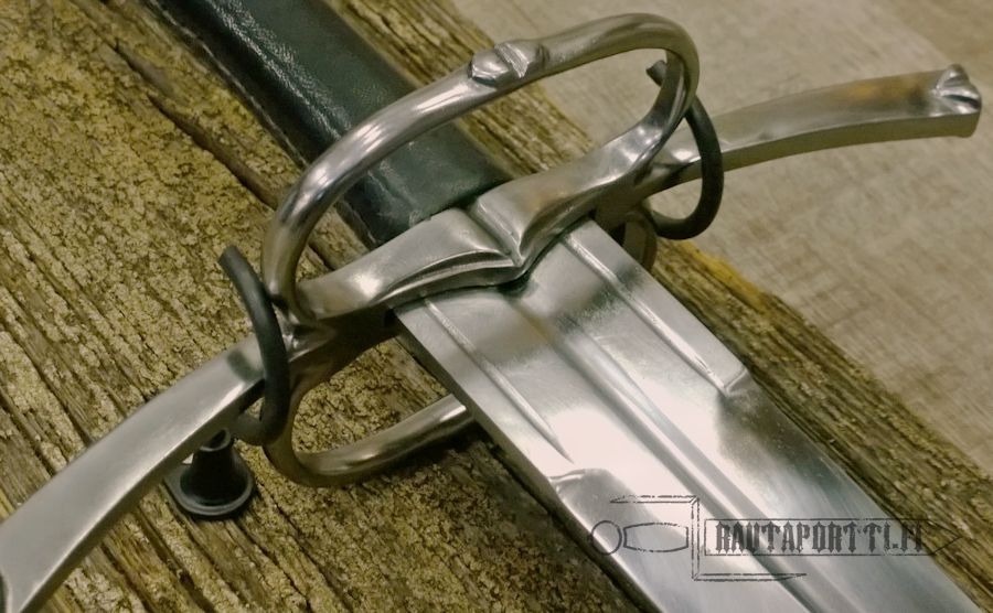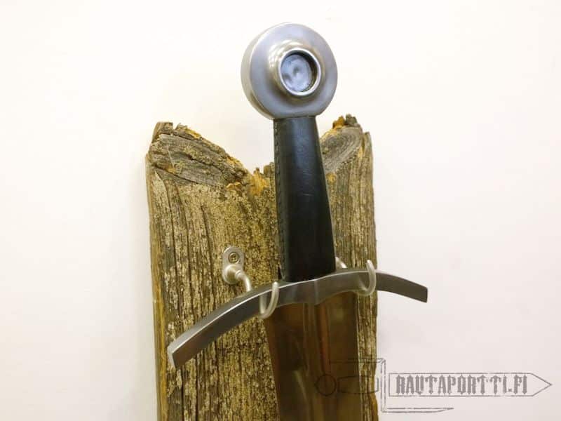 - Miekan saa ripustettua näiden koukkujen avulla niin pystyyn, vaakaan kuin vinoonkin (esim. kaksi miekkaa ristiin seinälle)