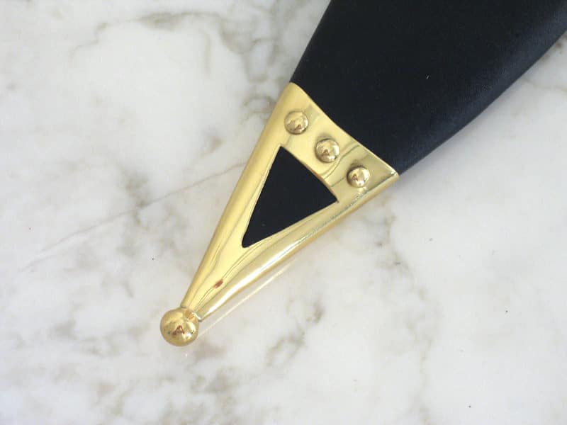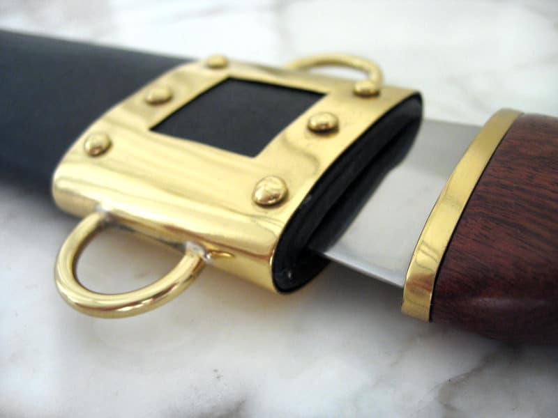 • Mukana nahalla päällystetty puinen tuppi, jossa messinkiset vahvikkeet