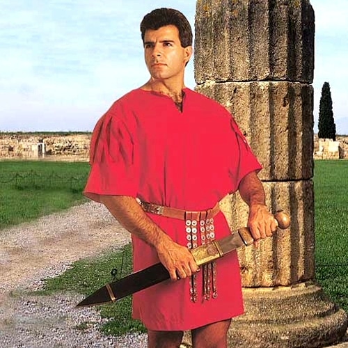 Myymämme kirkkaan punainen tunika on kopio Rooman legioonien standarditunikasta jollaisia käytettiin aina Rooman tasavallan ajalta keisarikunnan romahdukseen asti (noin vuoteen 400jaa. asti). Tunikaa käyttivät kaikki sotilaat tavallisista rivisotilaista korkeimpiin kenraaleihin asti, joko haarniskan alla tai sellaisenaan. Tällaista yksinkertaista ja klassista tunikan leikkausta on käytetty lukemattomissa myöhempien aikojen vaatteissa. Tunikan helma ulottuu puoleen reiteen ja antaa vaatteelle yksilöllisen ja tunnistettavan leimansa. Tunika on saatavilla vain punaisena. Värinä, jonka Roomalaiset kopioivat Spartalaisilta, jotka käyttivät punaista jottei vihollinen ikinä näkisi Spartalaisen vuotavan verta.