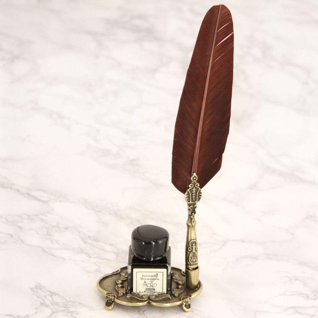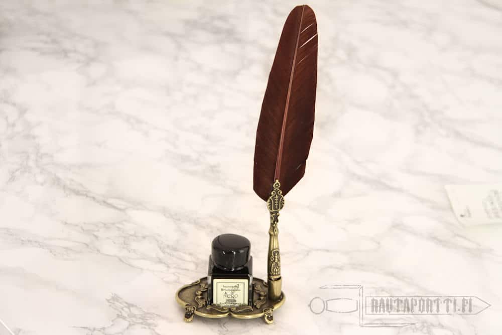 Kirjeen kirjoittaminen käsin, varsinkin mustekynällä, on nykyään hyvin harvinaista. Vaikka kauniin käsinkirjoitetun tekstin tuottaminen ei enää olekaan osa jokapäiväistä kulttuuria, tällä hanhensulkaisella mustekynäsetillä saa herätettyä hieman näitä vanhoja perinteitä henkiin. Setti on tyylikkäästi ja klassisesti pakattu, mikä tekee tästä sellaisenaan upean lahjan merkkipäivänä tai vaikka vastavalmistuneelle. Sulkakynäsetti sopii myös aloittelevalle kalligrafistille. Valmistettu Italiassa käsityönä.
