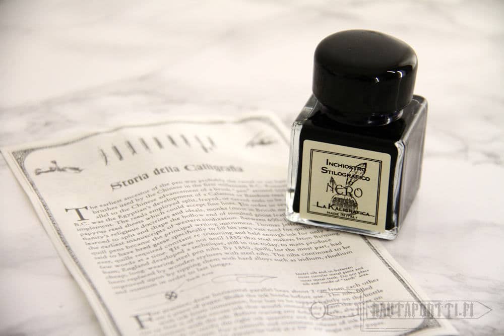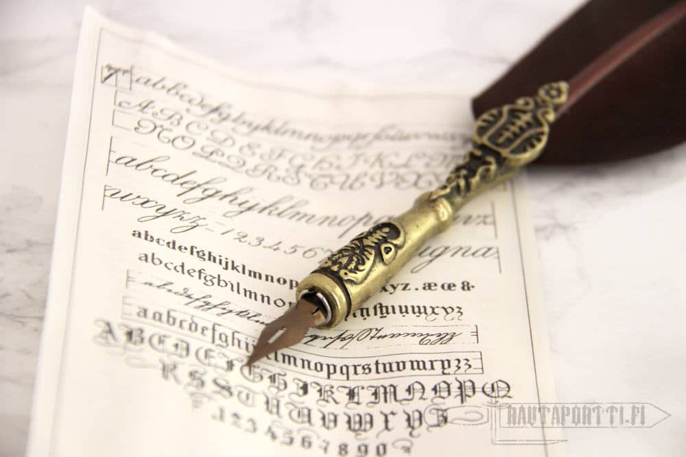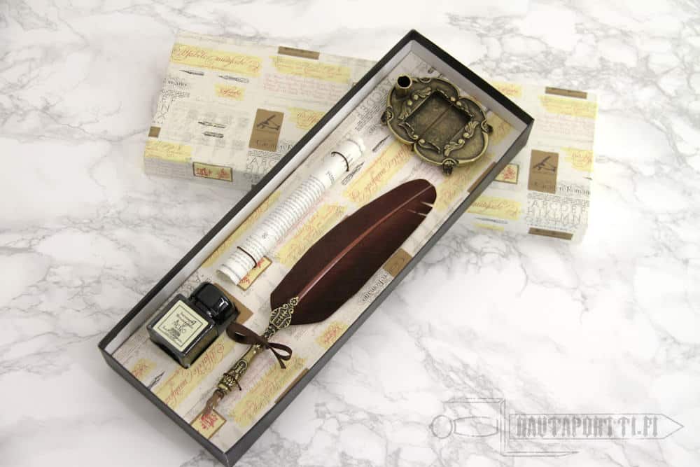 Hanhensulkaisen sulkakynän (käsiosa kovatinaa), pullon mustaa mustetta, kovatinaisen telineen mustepullolle ja kynälle, kalligrafian historiasta kertovan kääreen jonka toisella puolella muutama fontti oppimateriaaliksi (teksti englanniksi).