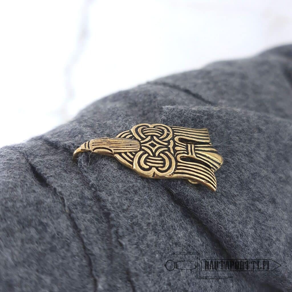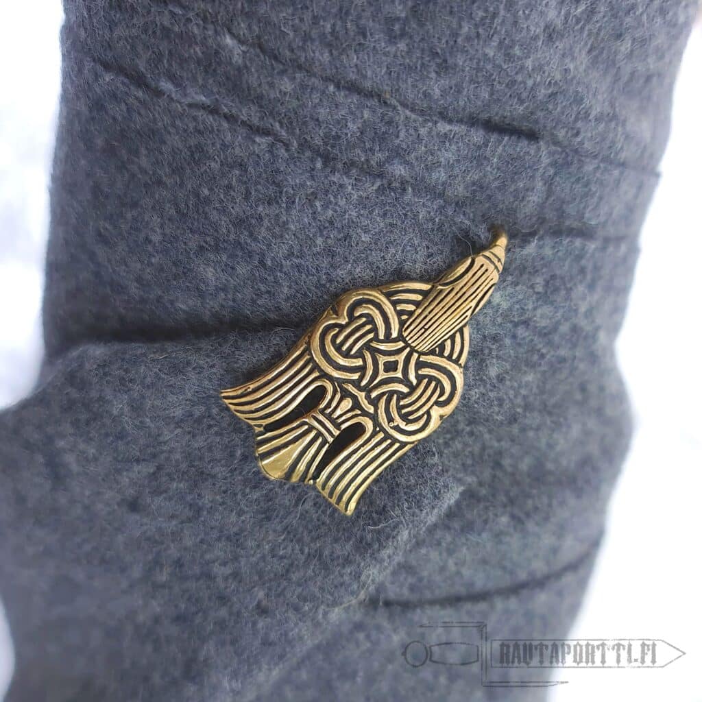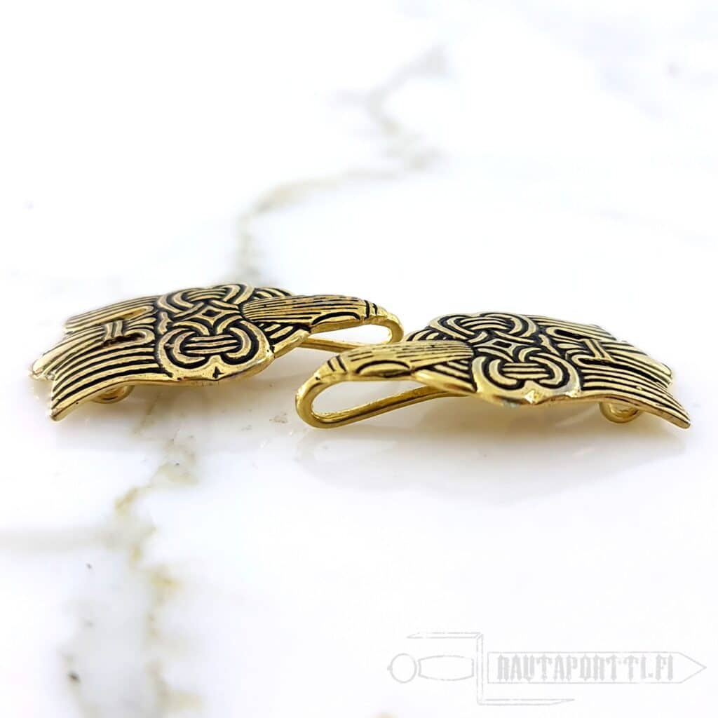 Nämä korppikuvioiset säärisiteiden kiinnityskoukut ovat jäljennös Tšernigovin viikinkiasutuksesta Ukrainasta löydetyistä kiinnityskoukuista. Ne ovat peräisin 900-luvulta. Miltein samanlaiset korppikuvioiset koukut on löydetty myös Gotlannista, Ruotsista.