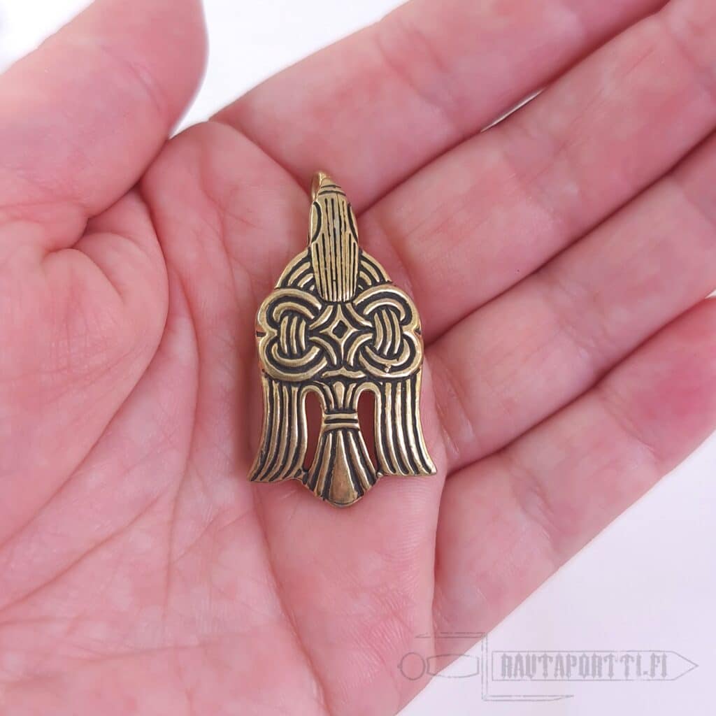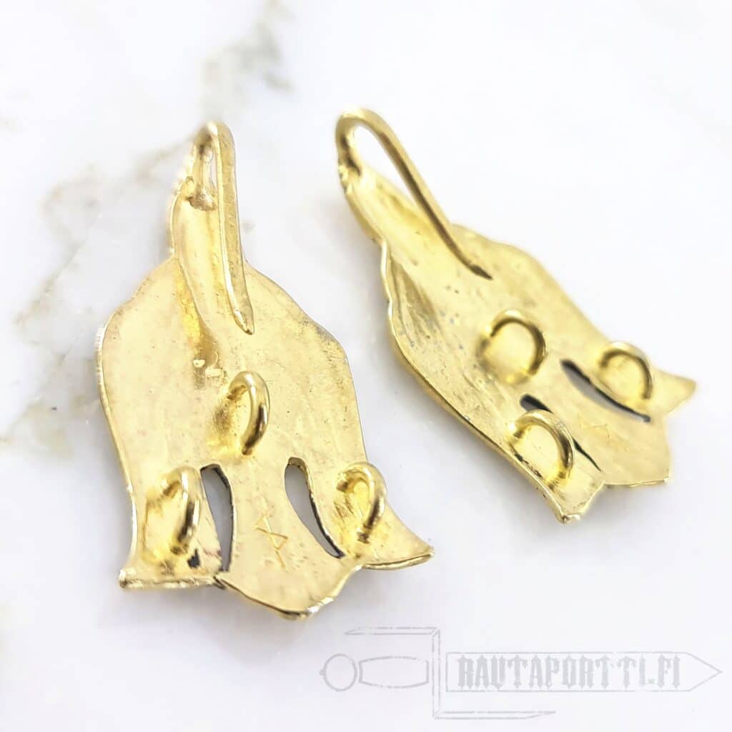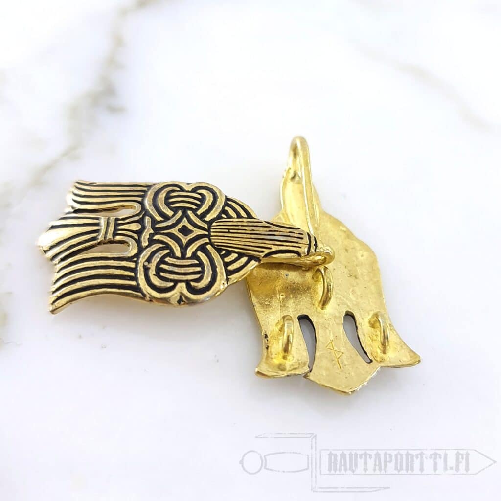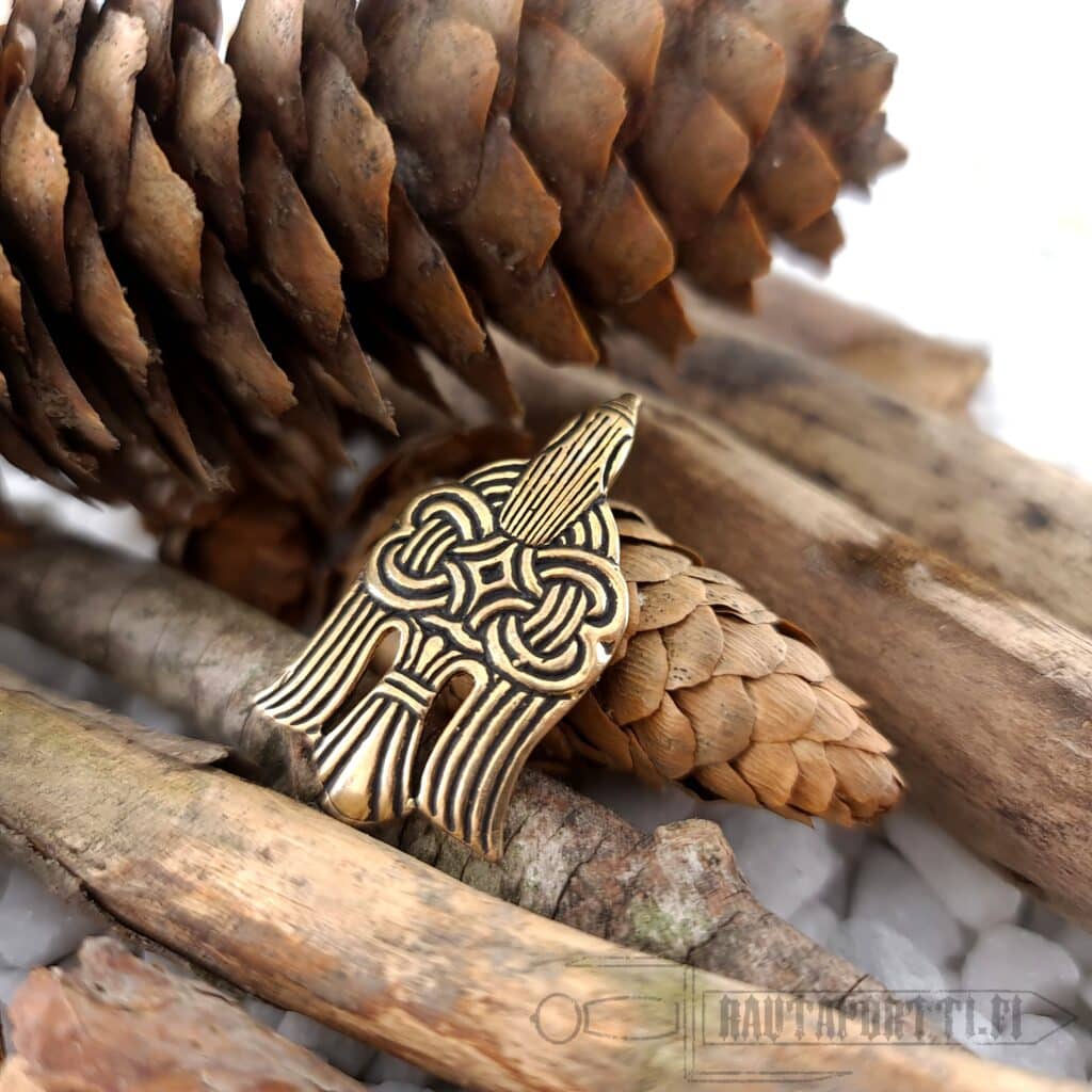Nämä korppikuvioiset säärisiteiden kiinnityskoukut ovat jäljennös Tšernigovin viikinkiasutuksesta Ukrainasta löydetyistä kiinnityskoukuista. Ne ovat peräisin 900-luvulta. Miltein samanlaiset korppikuvioiset koukut on löydetty myös Gotlannista, Ruotsista.
