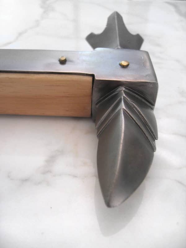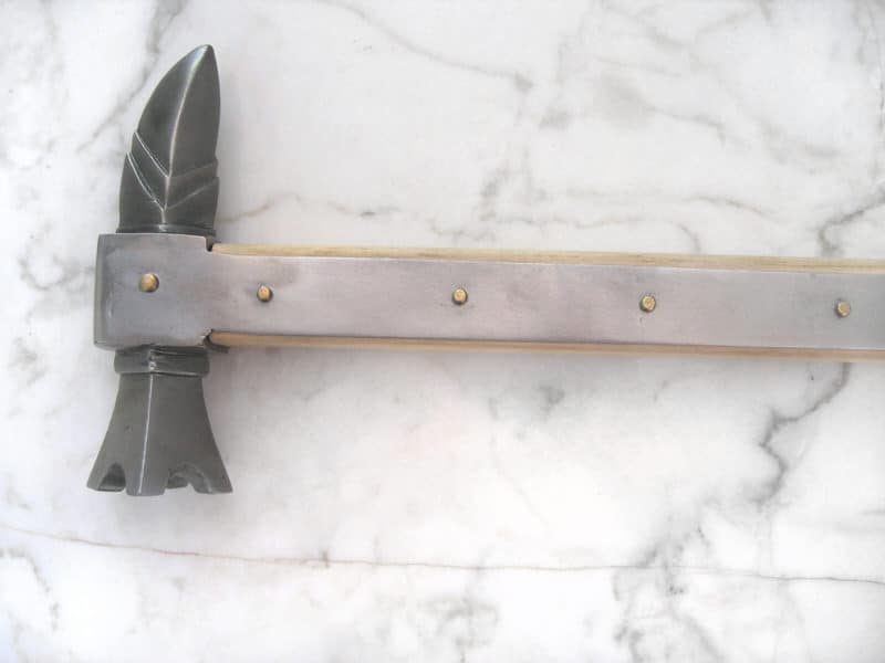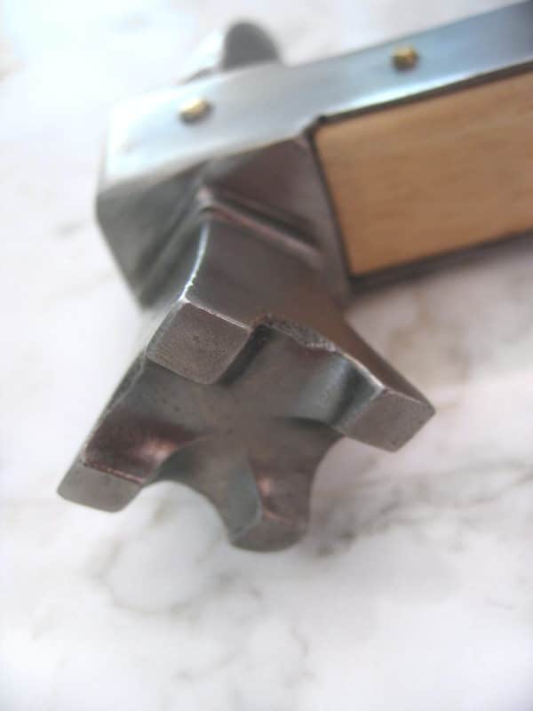 Levypanssarien tullessa käyttöön ja niiden kehittyessä ympäri keskiaikaista Eurooppaa, yleistyivät ja kehittyivät samalla myös kaikki murska-aseet. Kun miekka oli käytännössä tehoton levypanssaria vastaan, ritarit ratsuillaan siirtyivät lyhytvartisiin sotavasaroihin (kuten tämä kappale), kirveisiin ja nuijiin. Tämän kaltaisen sotavasaran piikkipäätä käytettiin yleensä rengashaarniskan läpäisyyn, kun taas levypanssarin kaarevaan pintaan soveltui tasaisempi (tässä tapauksessa nelipiikkinen) pää paremmin. Tämä kaunis ja vaikuttava ase on kopioitu Nurbergissa olevasta Saksan kansallismuseon alkuperäiskappaleesta. Teräksisen pään tukeva kiinnitys on varmistettu kovapuisen varren suuntaisella teräksisellä liuskalla, joka tasasi kärkeen kohdistuvaa kovaa vääntöä iskun aikana. Messinkiset niitit kahvassa varmistavat tukevan otteen.