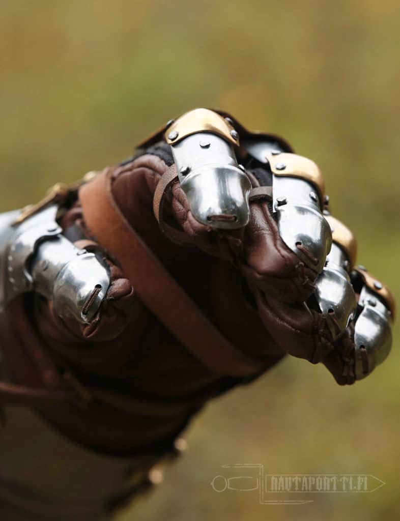 - Rystyset ja sormien nivelet on koristeltu messinkiheloilla