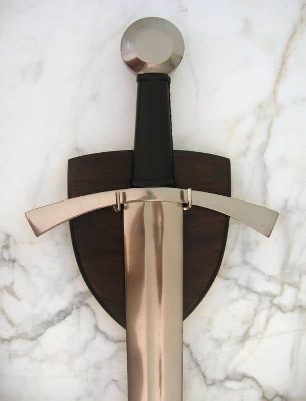 Nyt saat ripustettua koko kokoelmasi esille! Tähän kilpeen sopii suurin osan markkinoilla olevista miekoista ja tikareista. Telineen saa helposti ripustettua seinälle yhdellä ruuvilla tai naulalla. Seinäteline on puinen ja klassisen keskiaikaisen kilven mallinen. Ripustuskoukkujen välinen etäisyys 6 cm (leveys) ja koukun reunan ja kilven välinen etäisyys 3,4 cm (syvyys).