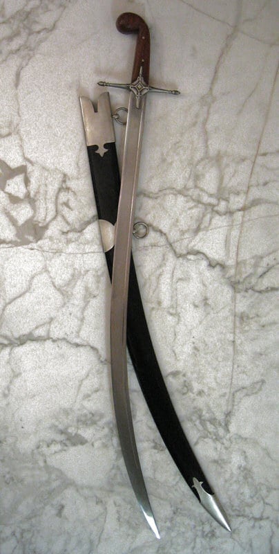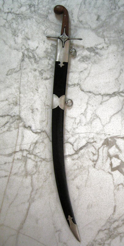 Alkuperäisiä Persialaisia sapeleita kutsuttiin nimellä shamshir (leijonan häntä). Ne olivat hyvin käyriä (lähes puoliympyröitä) ja pelkkiin viiltoihin tarkoitettuja miekkoja. Koska näillä miekoilla oli hyvin rajalliset käyttömahdollisuudet ne muuntuivat pikkuhiljaa monikäyttöisempiin malleihin. Meidän myymässämme mallissa terä on muodoltaan jo hyvin monikäyttöinen ja tehokas. Tämä miekka soveltuu niin viiltoihin, lyönteihin kuin tietyn tyyppisiin pistoihinkin. Persia oli aikanaan supervalta ja kävi monia sotia niin antiikin Kreikkaa, Roomaa kuin Bysanttiakin vastaan. Aleksanteri Suuren voitettua Persian kuninkaan Dareios III:n ja valloitettua koko Persian valtakunnan 300-luvulla eaa. Persia kuului Aleksanteri Suuren imperiumiin. Unelma yhteisestä kulttuurista ja rauhasta ei kuitenkaan kestänyt kauaa sillä Makedonialaiset eivät saaneet pidettyä valtavaa maata hallinnassaan Aleksanteri Suuren kuoltua. Valloitettu imperiumi hajosi yhtä nopeasti kuin se oli rakennettukin. Tämä kaunis miekka vie välittömästi ajatukset kadonneen maailman seikkailuihin, missä haaremit ja hiekkamyrskyt ovat arkipäivää. Miekan alkuperäiskappale löytyy Hank Reinhardtin yksityiskokoelmasta. Shamshirin väisti on terästä ja kahva puuta. Hintaan sisältyy nahkainen huotra, missä on teräksiset ripustusrenkaat.