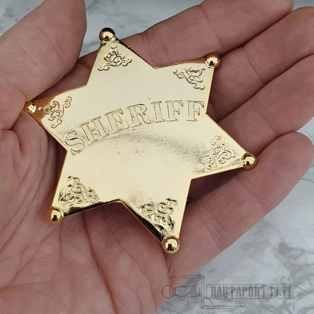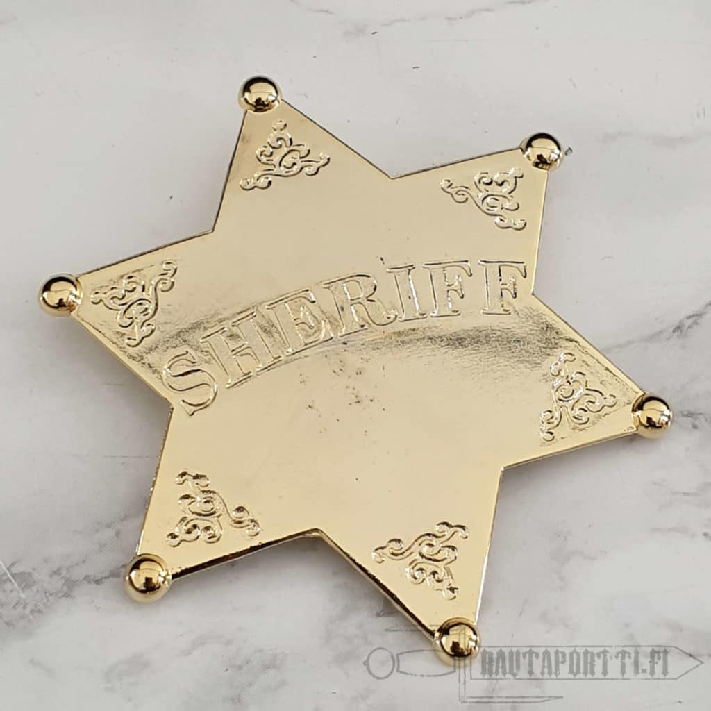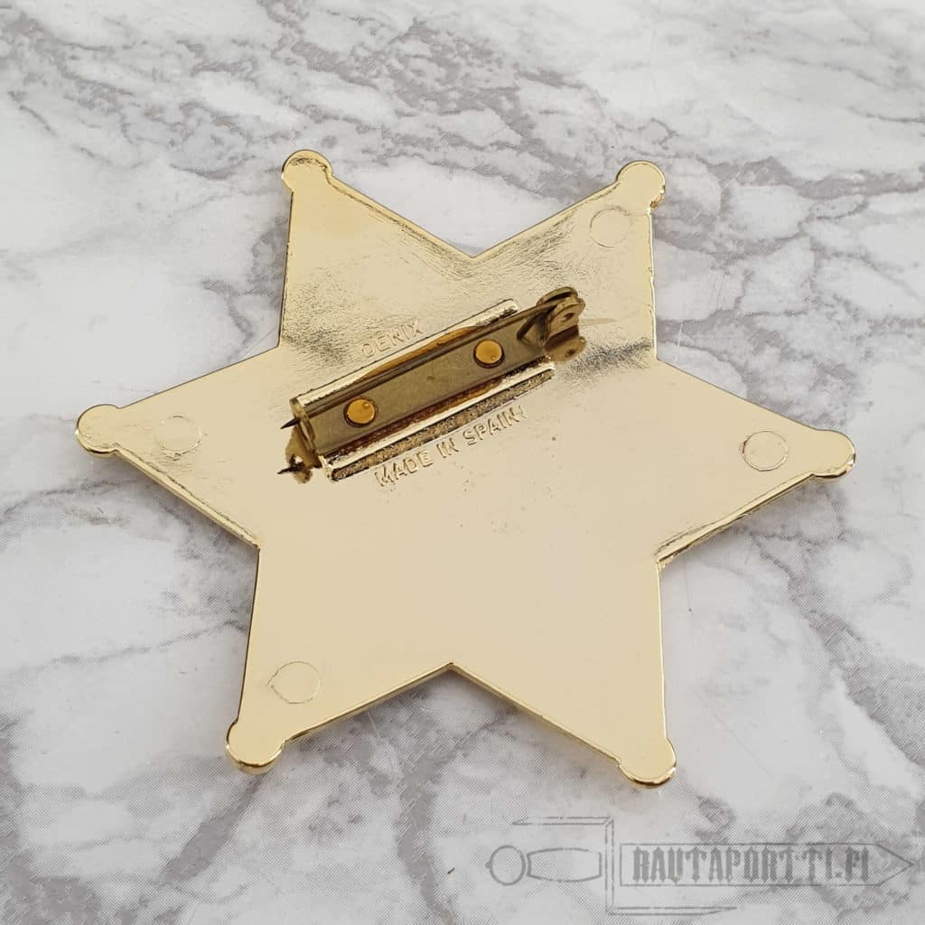 Kuusikärkinen Sheriffin tähti kiinnitysneulalla.