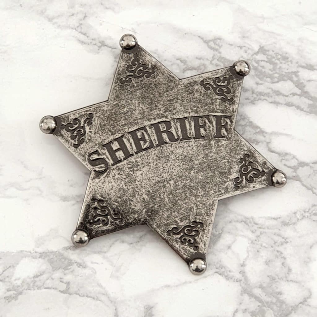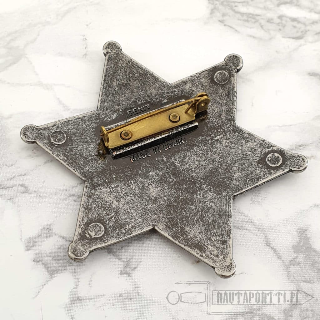 Kuusikärkinen sheriffin tähti kiinnitysneulalla.