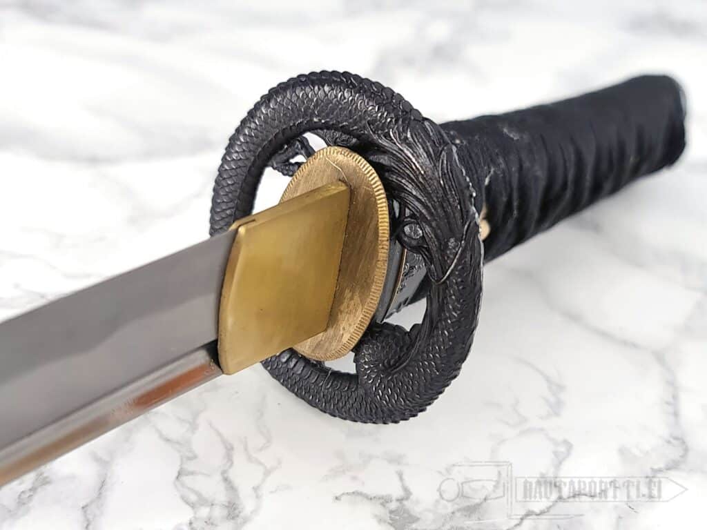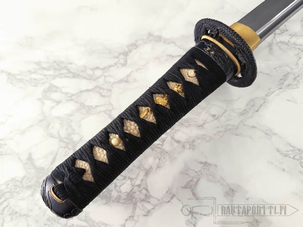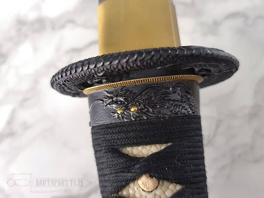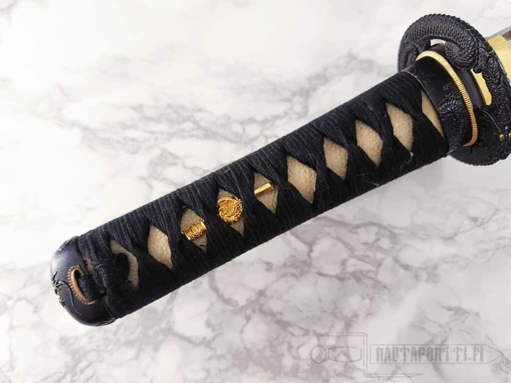 Kahvassa on aitoa valkoista samea (rauskun nahkaa) ja kahvan nyöritys (tsuka-ito) on valmistettu korkealaatuisesta mustasta japanilaisesta puuvillasta. Tsuka on koristeltu messinkisillä menuki-koristeilla, jotka koristavat kahvaa, mutta mahdollistavat myös paremman otteen kahvasta. Puinen saya on viimeistelty syvänmustalla lakalla ja mustalla puuvillaisella sageolla. Rautainen tsuba muodostuu hienosti kaiverretusta lohikäärmeestä. Tsuban molemmat puolet ovat saman lohikäärmeen jatkumoa ja pienet detaljit ovat kullalla päällystettyjä. Tämä wakizashi toimitetaan suojaavan kangaspussin ja perinteisen japanilaisen huoltosarjan kanssa.