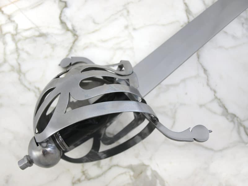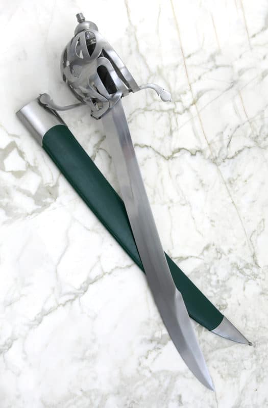 Windlass Steelcraftsin valmistama. Terä on käsintaottu hiiliteräksestä. Korikahva on terästä ja puinen kahva on päällystetty nahalla. Nahkainen tuppi teräsheloilla sisältyy hintaan. Alkuperäinen miekka noin 1690-luvulta.