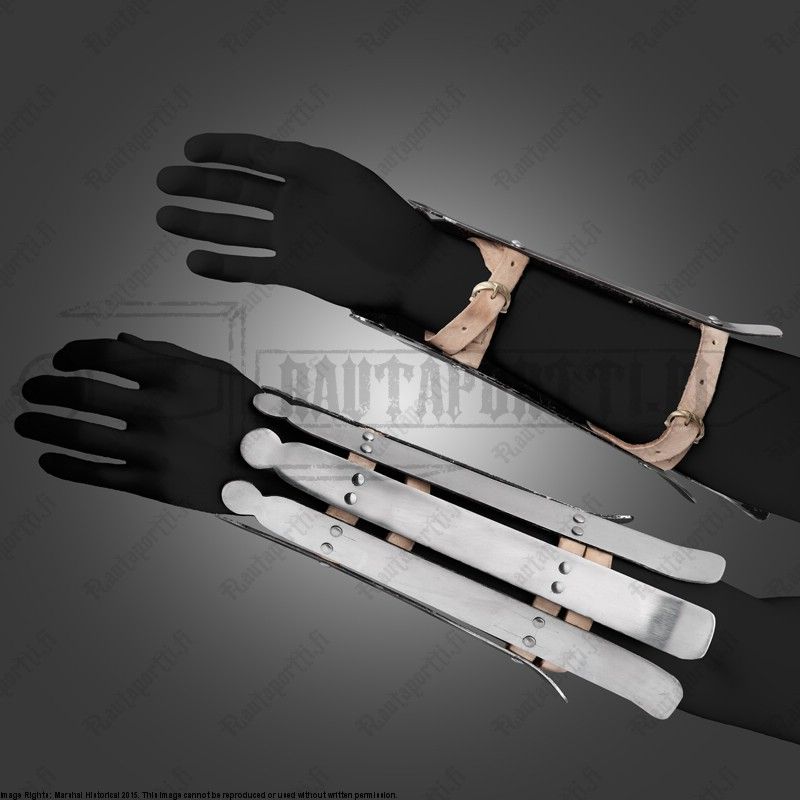 Tämän tyyppinen panssarointi ei merkittävästi vaikeuta liikkuvuutta eikä tuonut paljoa lisäpainoa miekkakäteen. Nämä suojat tarjosivatkin soturille erinomaisen tavan suojata käsivartensa ranteesta kyynärpäähän. Nämä splinttisuojat ovat saaneet inspiraationsa Vendel-ajan Valsgärden löydöstä, mutta olemme jättäneet ne mahdollisimman yksinkertaisiksi jotta ne ovat historiallisesti tarkat mahdollisimman pitkän ajanjakson, aina pimeän keskiajan melskeistä varjaagien kautta ritariaikaan.