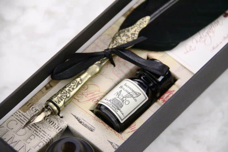 Kirjeen kirjoittaminen käsin, varsinkin mustekynällä, on nykyään hyvin harvinaista. Vaikka kauniin käsinkirjoitetun tekstin tuottaminen ei enää olekaan osa jokapäiväistä kulttuuria, hanhensulkaisella mustekynäsetillä saa herätettyä hieman näitä vanhoja perinteitä henkiin. Setti on tyylikkäästi ja klassisesti pakattu, mikä tekee tästä sellaisenaan upean lahjan merkkipäivänä tai vaikka vastavalmistuneelle. Sulkakynäsetti sopii hyvin aloittelevalle kalligrafistille. Valmistettu Italiassa käsityönä.