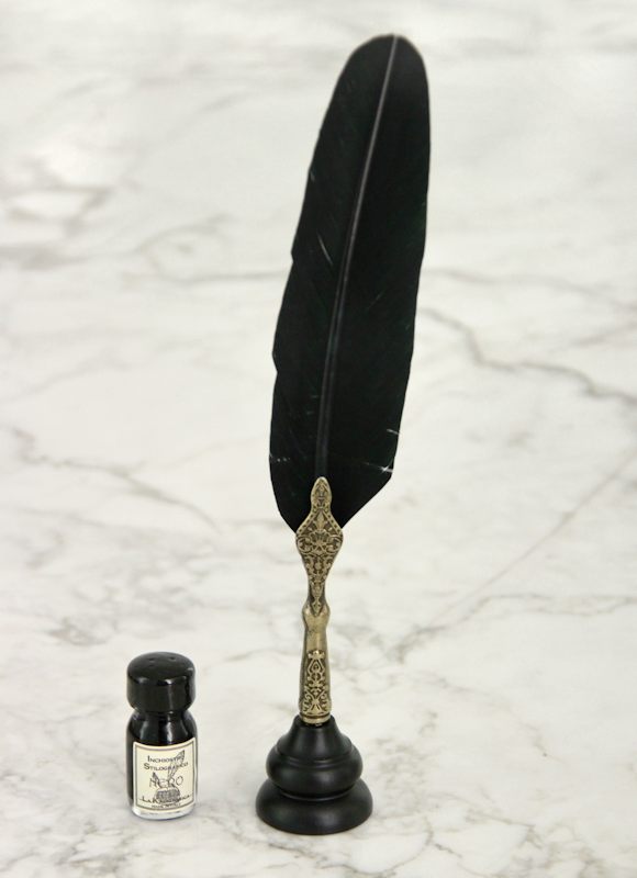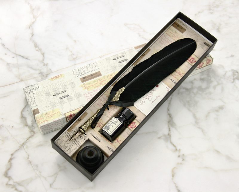 Sulkakynäsetti sisältää hanhensulkaisen sulkakynän (käsiosa kullattua kovatinaa), pullon mustaa mustetta ja tyylikkään puisen kynätelineen.