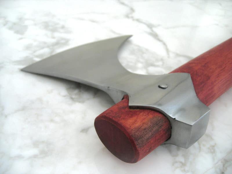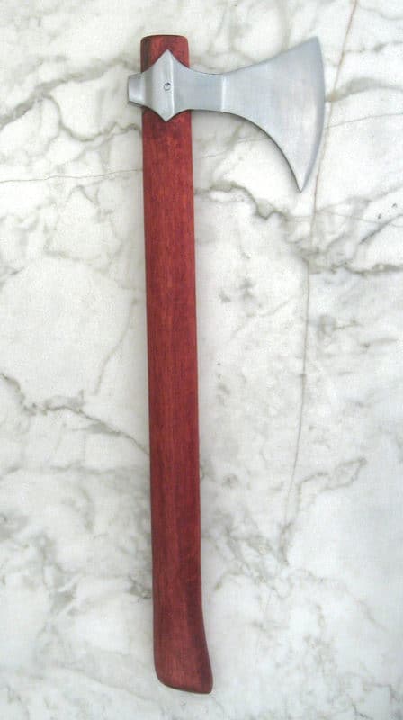 Viikinkien uhreille hyökkääjät olivat aina tanskalaisia tulivatpa he sitten Ruotsista, Norjasta taikka ihan oikeasti Tanskasta. Lähes kaikki tuntevat suuren tanskalaisen kirveen, joka kulki aikanaan mm. tanskalaisten mukana ympäri tunnettua maailmaa. Näiden valtavien kirveiden rinnalla käytettiin laajalti myös pienempiä kirveitä. Pienemmät kirveet sopivat hyvin niin arjen pieniin askareisiin kuin sotaretkillekin. Kirvestä pystyi käyttämään tarvittaessa heittokirveenä ja lähitaistelussa pieni ja nopea käsiase toimi tehokkaasti joko kilven kanssa käytettynä tai vaikkapa kilven tilalla taistelijan kädessä. Hiiliteräksinen terä on kiinnitetty puisen varren läpi isketyllä niitillä. Tämä kirves ei ole pelkästään hieno historiallisen aseen jäljennös, vaan myös käyttökelpoinen ja näppärä työväline nykypäivänäkin. Alkuperäinen noin 850-luvulta.