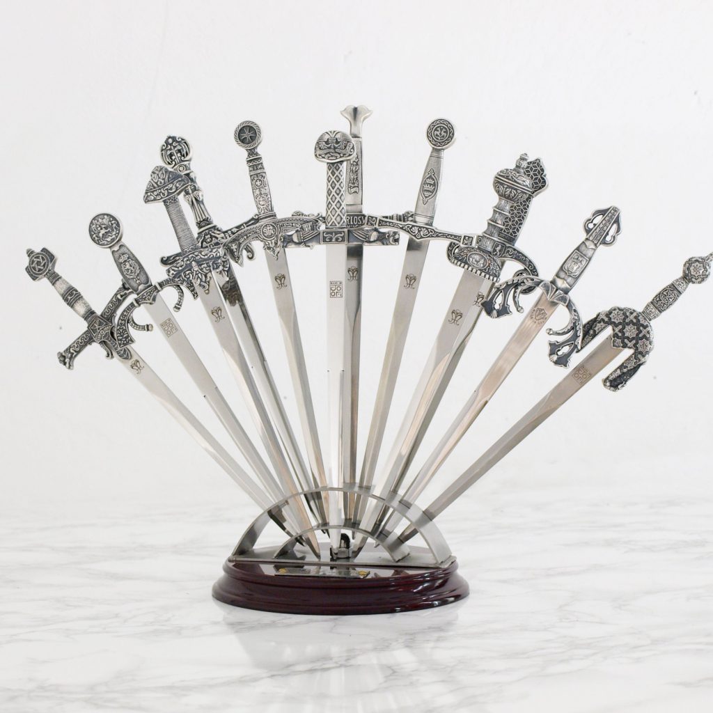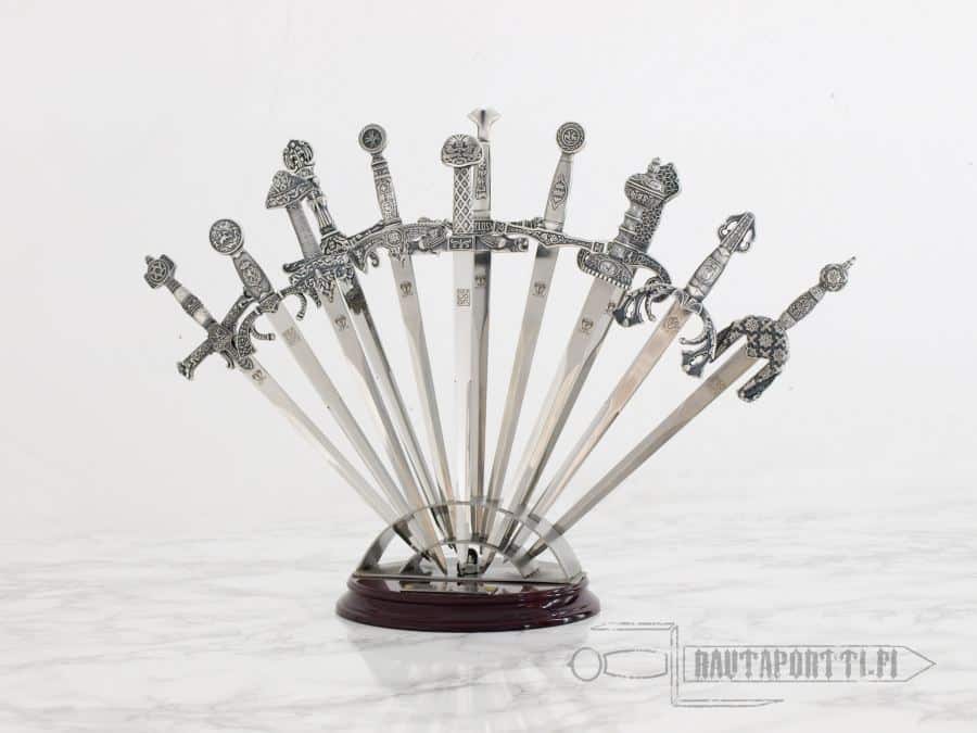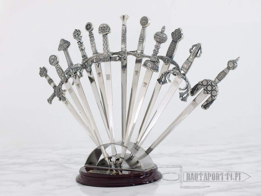 Teline kahdelletoista kirjeenavaajamiekalle. Tehty erityisesti toimimaan yhteen Marton valmistamien 26 cm pitkien minimiekkojen kanssa. Telineeseen saat esille lempimiekkasi joko kotiin tai toimiston pöydälle, jossa miekat ovat aina valmiina käyttöön omalla paikallaan ja tietysti siistinä historiallisena koriste-elementtinä.