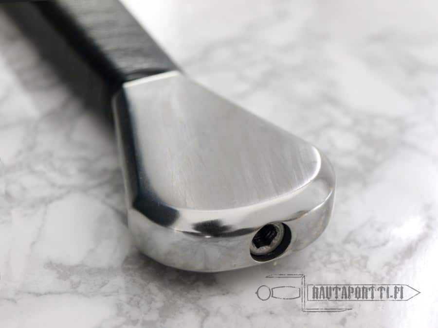 Miekassa on Oakeshott tyypin T1 ponsi, eli litistetty ”scent-stopper”, joka muodostaa luonnollisen jatkeen puiselle viistokulmaiselle kahden käden kahvalle. Puinen kahva on kiedottu nyörillä ja tämän jälkeen päällystetty nahalla. Väisti on suora ja kulmikas. Ruodin pää on kierteistetty ja ponnen päässä on syvennys kuusiokolomutteria varten, jolla koko kahvarakenne kiinnitetään ja kiristetään. Tämä rakenne mahdollistaa kahvarakenteen helpon purkamisen tarkastusta, muutostöitä ja vaikka terän vaihtoa varten. Miekan mukana toimitetaan puinen nahalla päällystetty huotra, jossa on teräksiset helat.