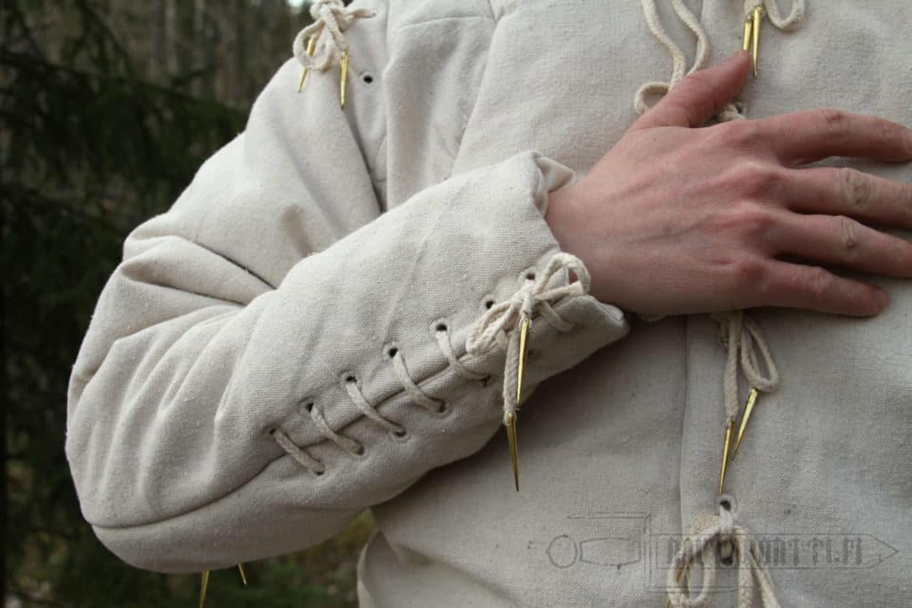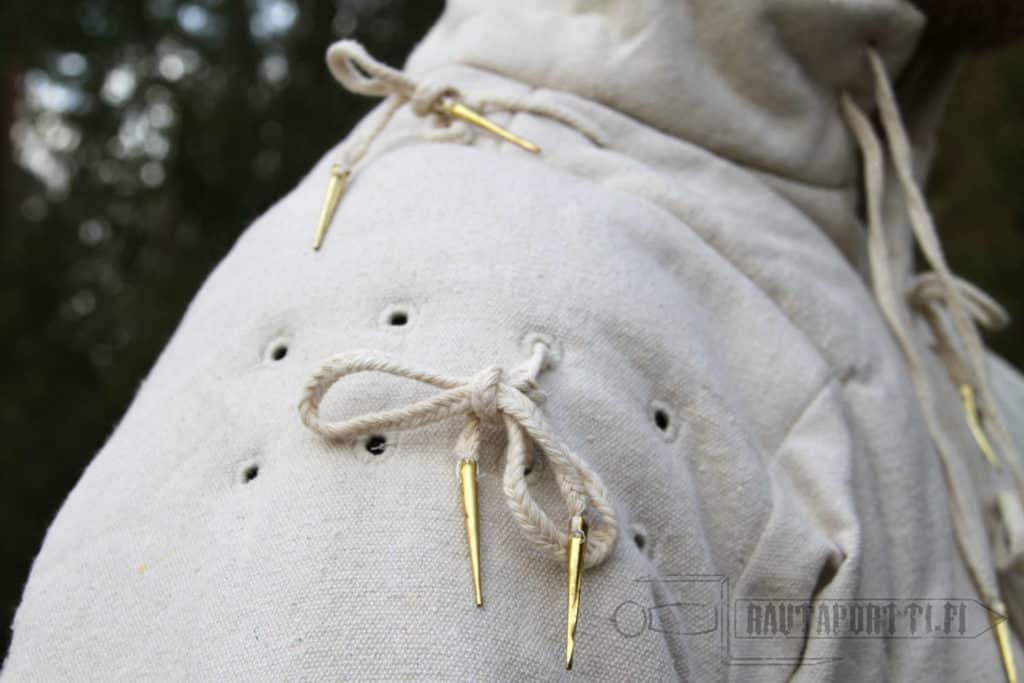 Takkiin olen ripustanut churburg-tyylin haarniskan. Pointtikohtiin suosittelen lisäämään esim. nahkavahvikkeet jottei narut pääse syömään kangasta rikki. Narut ovat vahvoja ja kestävät hyvin käyttöä. Liotuspesussa kylmällä vedellä kutistui sen verran että hihojen jatkopalat tulivat tarpeeseen. Paksuutta tarpeeksi pehmentämään haarniskan painoa esim. olkapäillä.