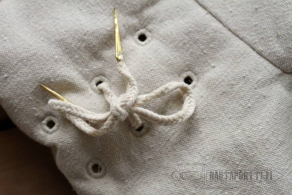 Mukana tulevat nyörit on valmistettu puuvillasta ja niiden molemmissa päissä on messinkiset kärjet helpottamassa pujottelua. Nyörien vahaaminen lisää niiden kestävyyttä huomattavasti, joten nyörien vahaaminen on suositeltavaa. Tämä tuote on valmistettu käsityönä eläväisestä kankaasta, jonka tarkoitus on esittää vanhaa käsintehtyä vaatetta. Kankaassa saattaa siis olla pieniä pintavaurioita tai epätäydellisyyksiä. Väri ja pintarakenne voi myös hieman vaihdella.