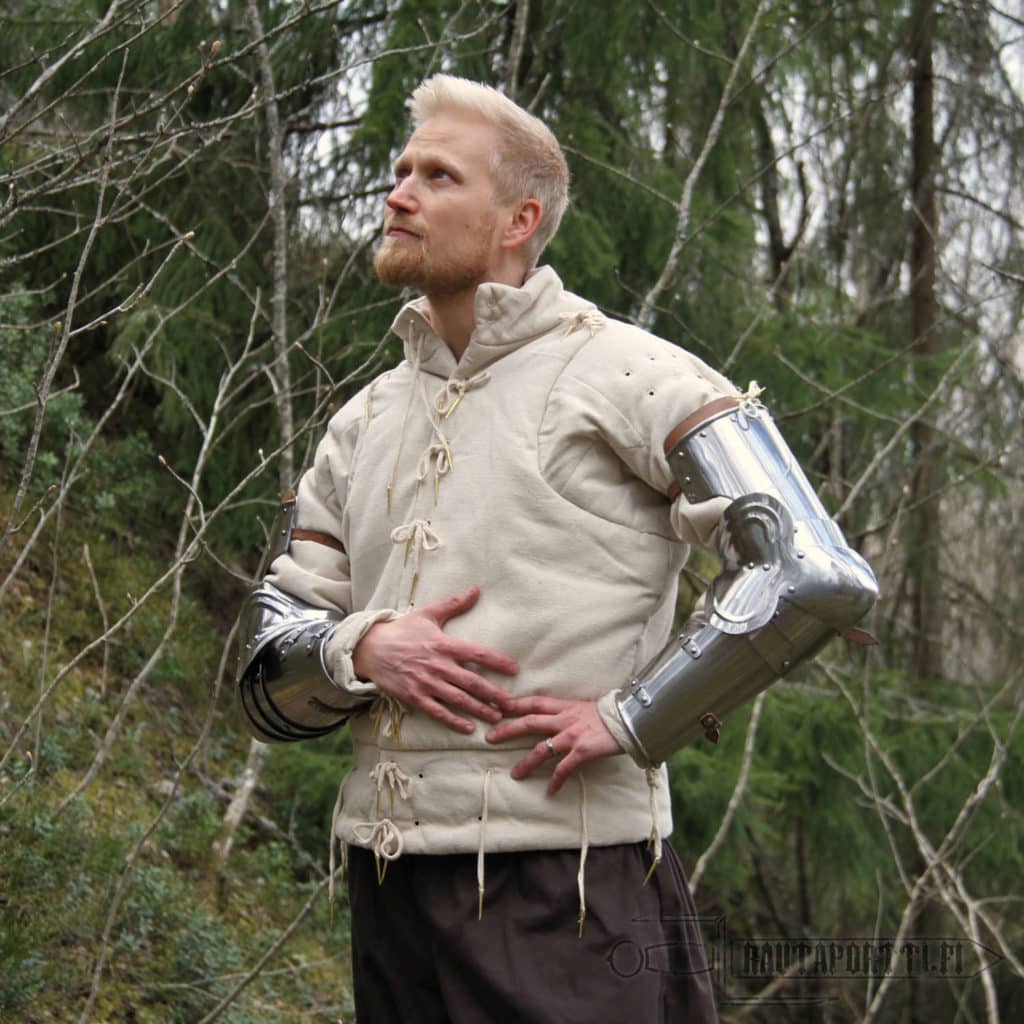 Pelkät levyhaarniskan teräsosat itsessään eivät riitä suojaksi soturille, vaan levyhaarniska tarvitsee jonkinlaisen pehmusteen haarniskapalojen alle pehmentämään iskujen voimaa ja poistamaan metallilevyjen aiheuttamat naarmut ja hankaumat. Tässä haarniskatakissa on korkea pystykaulus, joka estää levyhaarniskaosien raapaisut ja rengashaarniskan hiertämisen myös herkän kaulan seudulla. Tämän tukevan haarniskatakin ulko- ja sisäpinta on 100% puuvillaa ja siinä on pehmeä ja mukavan tuntuinen 100% polyesteristä tehty pehmuste. Takin ulkopinnan kangas on tehty karkean näköisestä pellavaa jäljittelevästä kudelmasta ja vuori sileämmästä ja pehmeämmästä kankaasta, tehden käytöstä astetta mukavampaa.