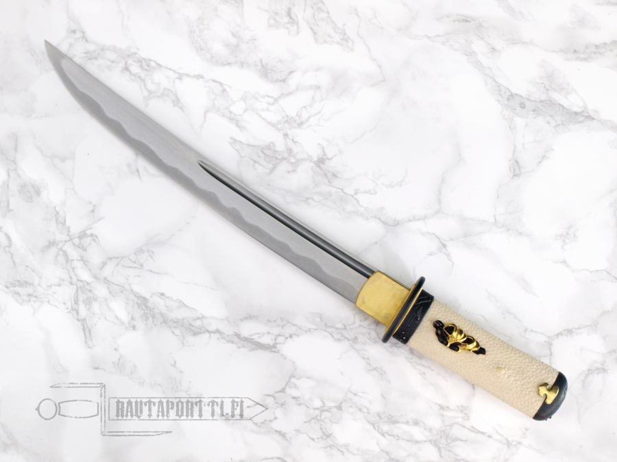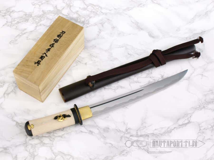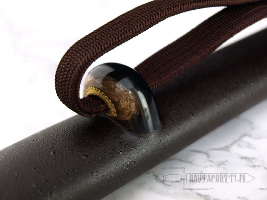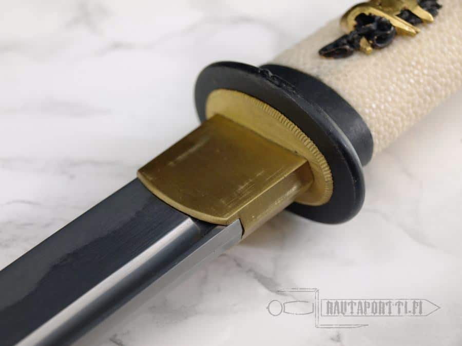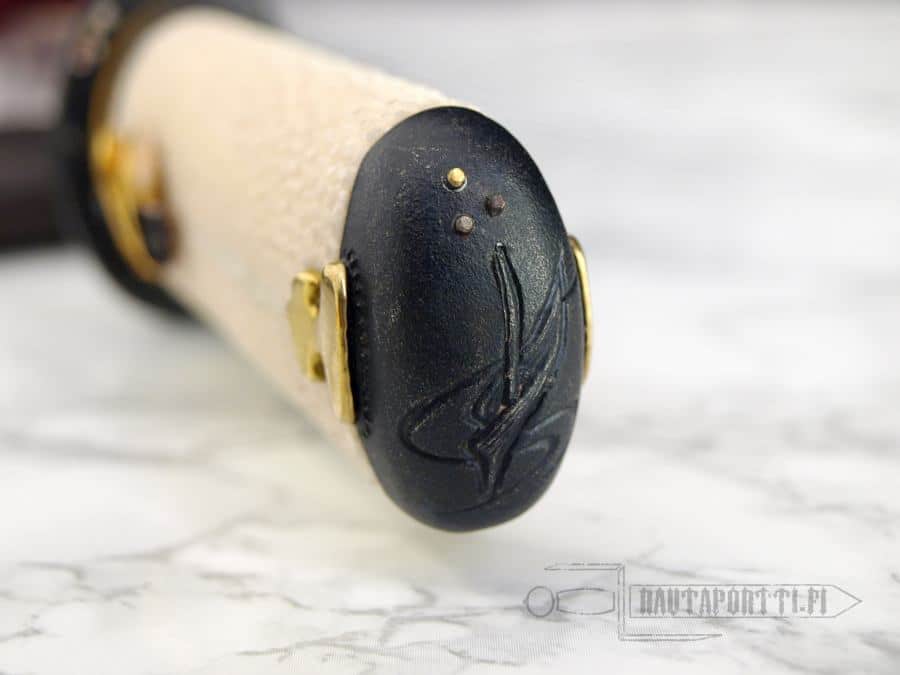 - Tsuka (kahva) on kokonaan kääritty korkealuokkaiseen rauskunnahkaan