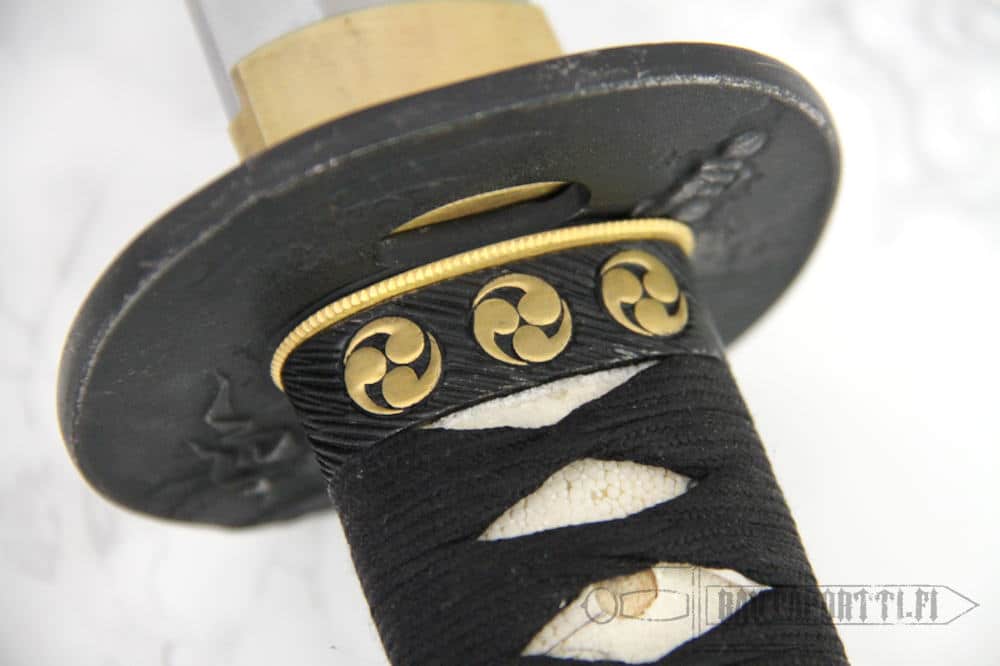 Fuchi ja kashira, kahvan molempien päiden sovitteet, on koristeltu mitsudomoe-motiivein. Mitsudomoe koostuu kolmesta ympyrän malliin asetetusta pilkusta tai pisarasta. Tällaiset kolmeen osaan jaetut ympyräsymbolit ovat universaaleja, niitä löytyy lähes kaikista kulttuureista, esimerkkinä kelttien triskele. Nämä kolmiosaiset ympyrät tulkitaan usein elämän kiertokulun symboleiksi, mutta Japanissa ja shintolaisuudessa mitsudomoe-symboli yhdistetään Hachimaniin, sodan ja jousiammunnan jumalaan. Soturien symbolina se on yleinen samuraiklaanien heraldiikassa. Tomoe, yksittäinen pilkku tai pisara mitsudomoessa, mielletään Hachimanin tapauksessa jousiampujan käsisuojaksi. Mitsudomoen pyörre symboloi myös vettä, ja sitä on käytetty loitsuna tulta vastaan.