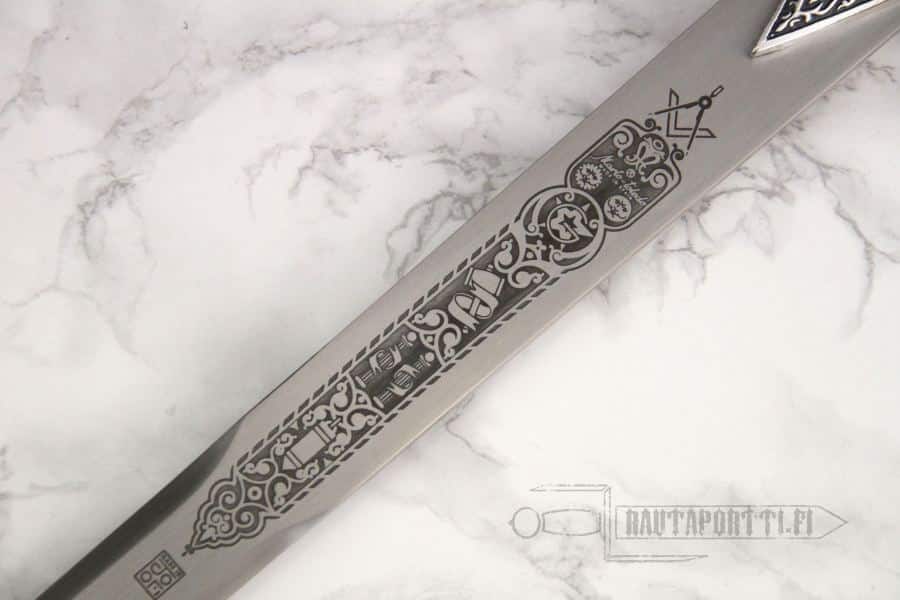 Miekassa on useita vapaamuurariuden symboleja: harppi ja suorakulma, luotilanka ja vasara, pyhä kirja ja kaikkinäkevä silmä, sekä viisisakarainen tähti, jossa kirjain G. G tarkoittaa joko suurta arkkitehtiä (Great Architect) tai geometriaa, tiedettä jonka uskottiin parhaiten paljastavan jumalan työt taivaissa. Amerikkalaisissa looseissa G tarkoittaa myös jumalaa (God). Suorakulma symboloi maallisia asioita, kuten kunniaa, rehellisyyttä ja sitä, miten meidän tulisi kohdata maailma ja muut ihmiset. Harppi symboloi hengellisyyttä, hyvin kehittyneen henkisen elämän ja itsekurin merkitystä. Symbolina vapaamuurarien miekka ei siis edusta miekan tyypillistä tuhoavaa luonnetta, vaan pyrkimystä itsensä rakentamiseen ja kehittämiseen sekä jokaisen yksilön erilaisuutta ja itsemääräämisoikeutta.